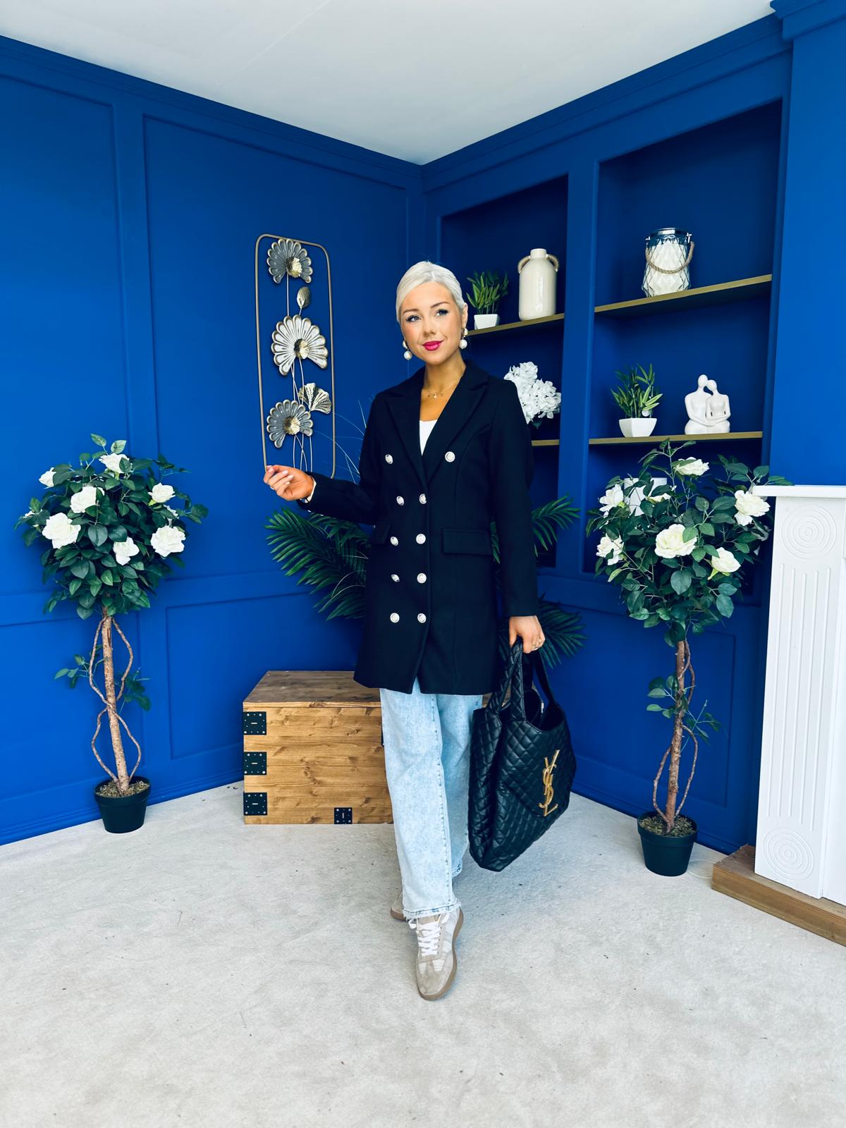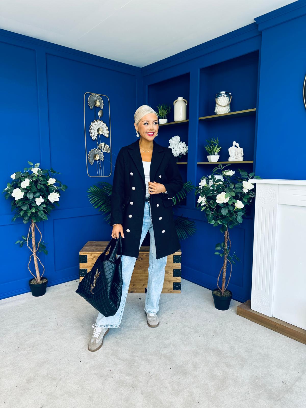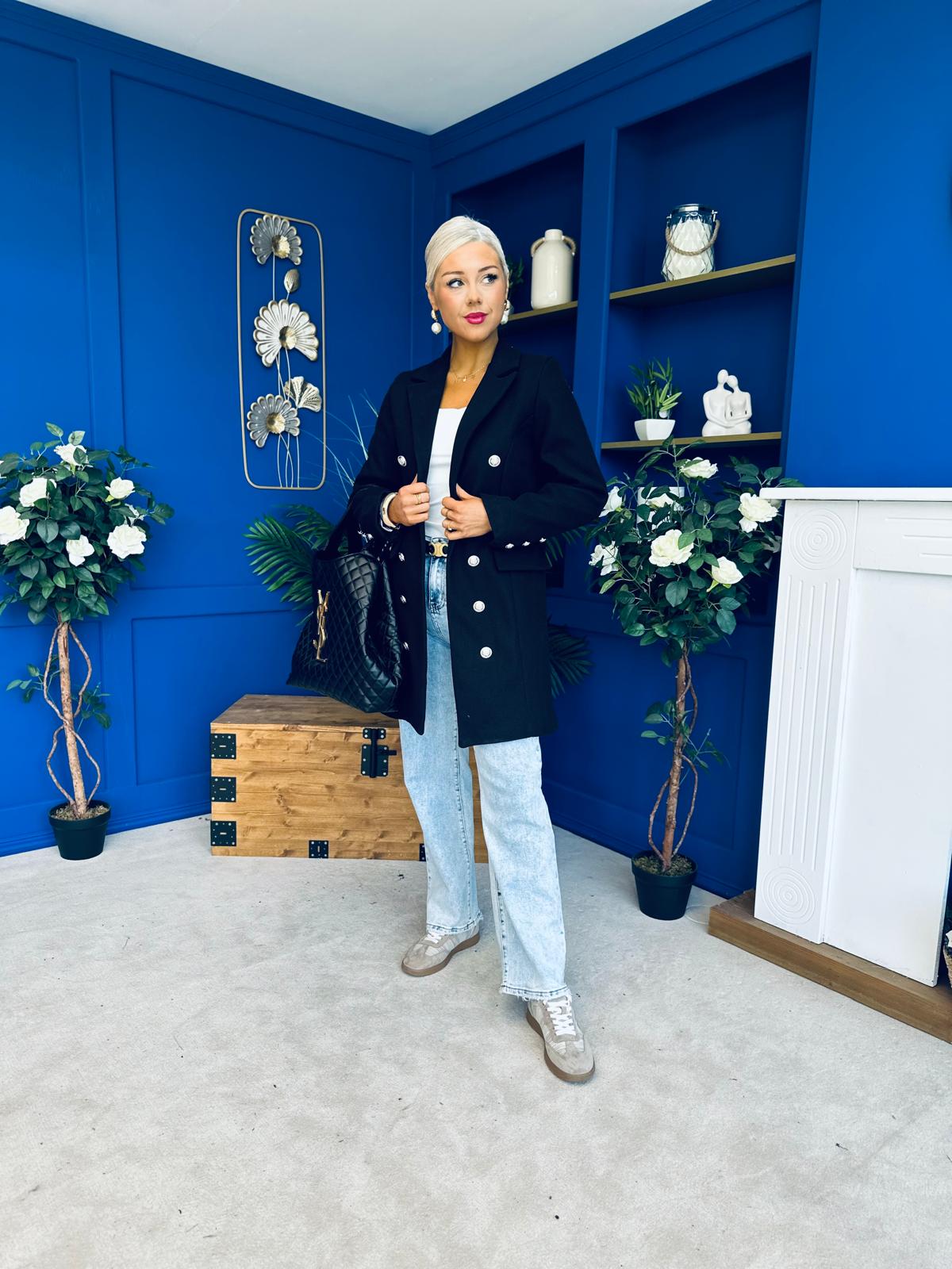 In a Bouble Breasted detailed Button closing style with faux button cuff detail