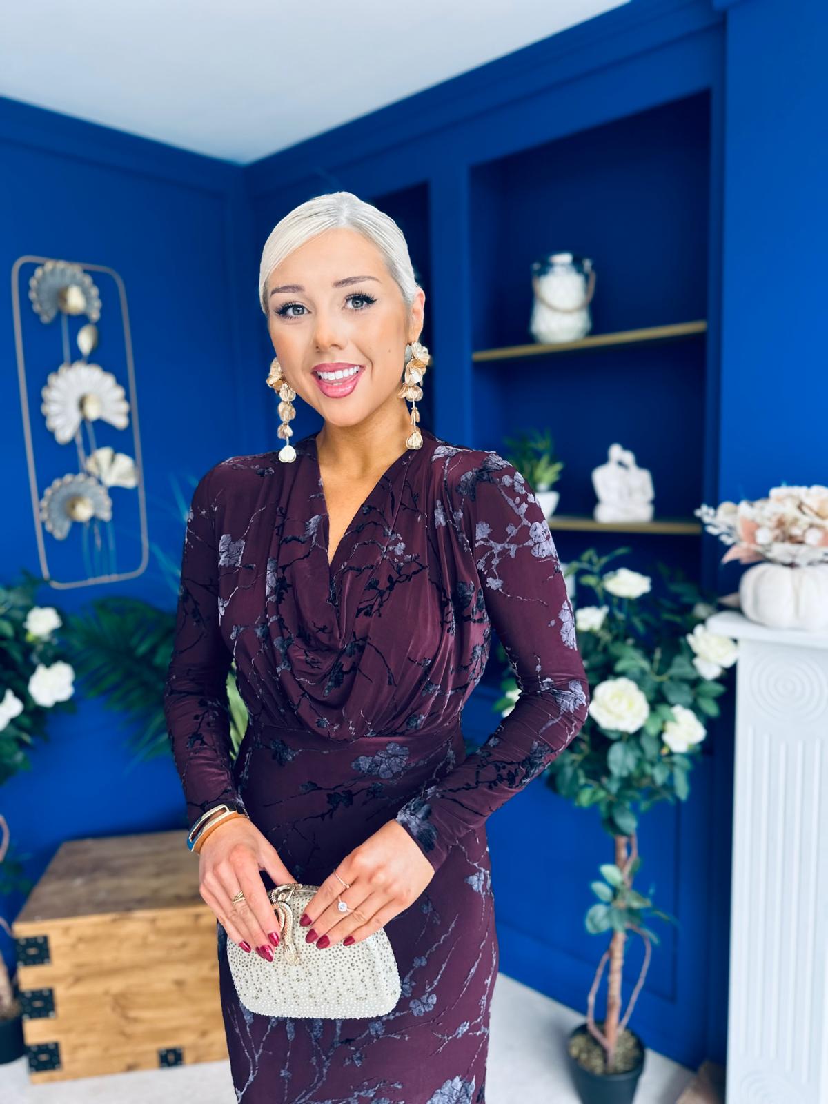 Remington Flocked Floral Cowl Neck Midi Dress Plum