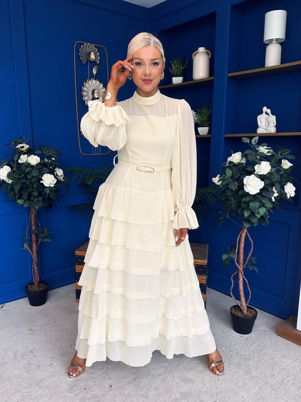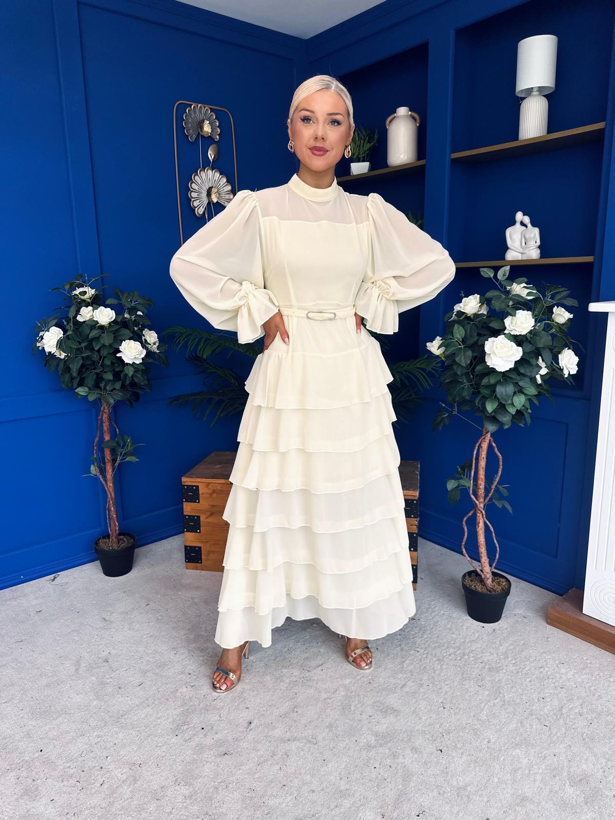 With a classic high neckline, matxhing belt, flowing layered skirt and a wonderful full sleeve.