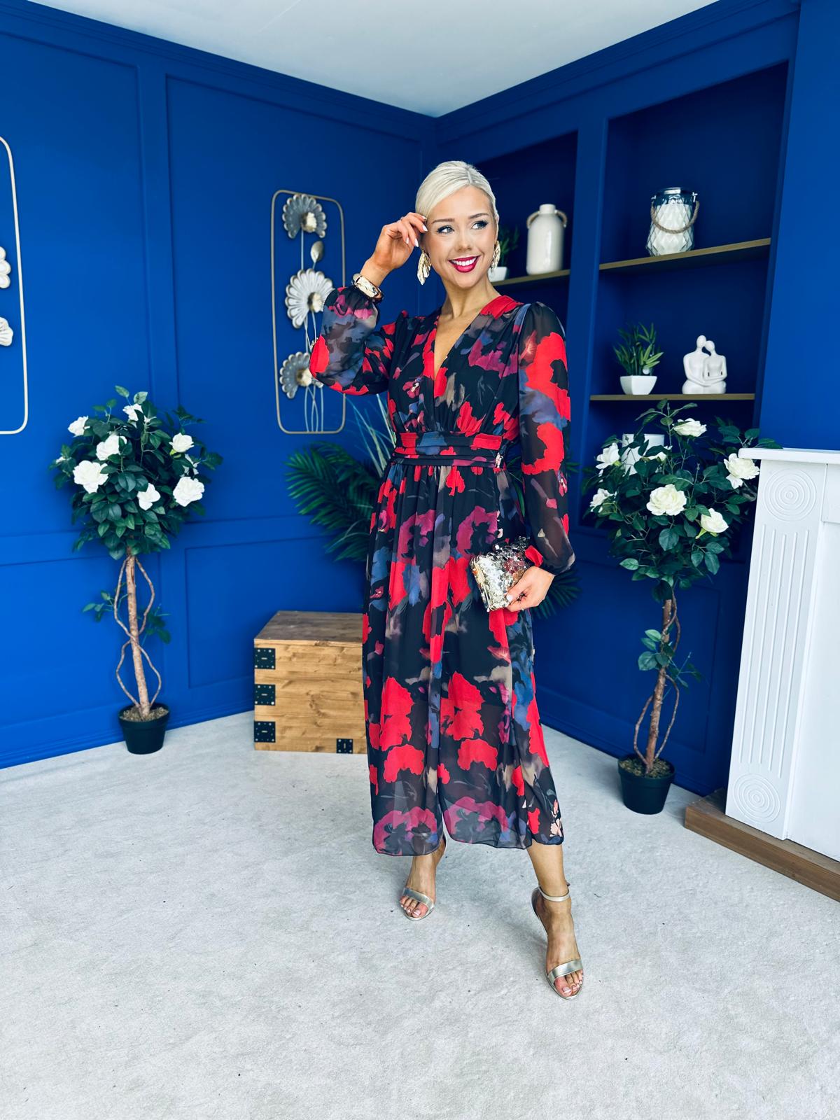 This occasion dress has a beautiful full sleeve, V neckline, pleated banded midriff, elasticated and flowing skirt for a statement silhouette and a flattering look, this dress will make you feel and look your best.