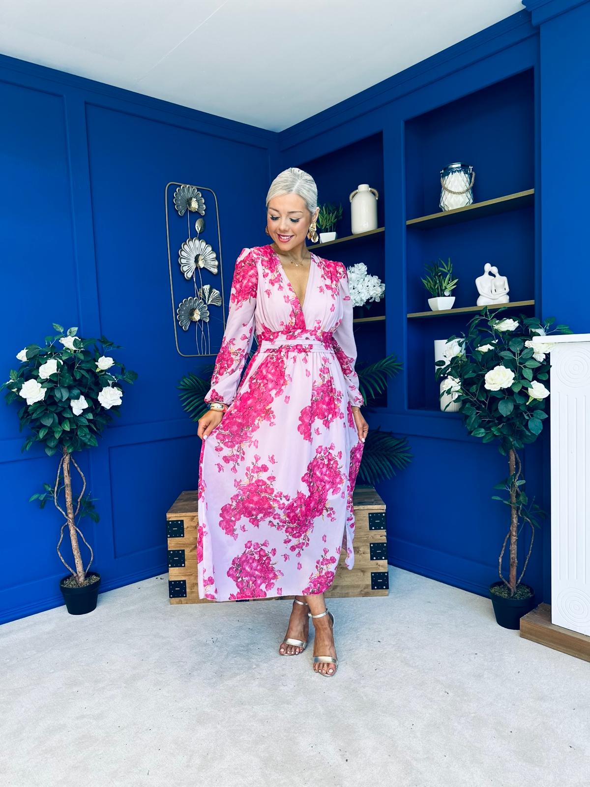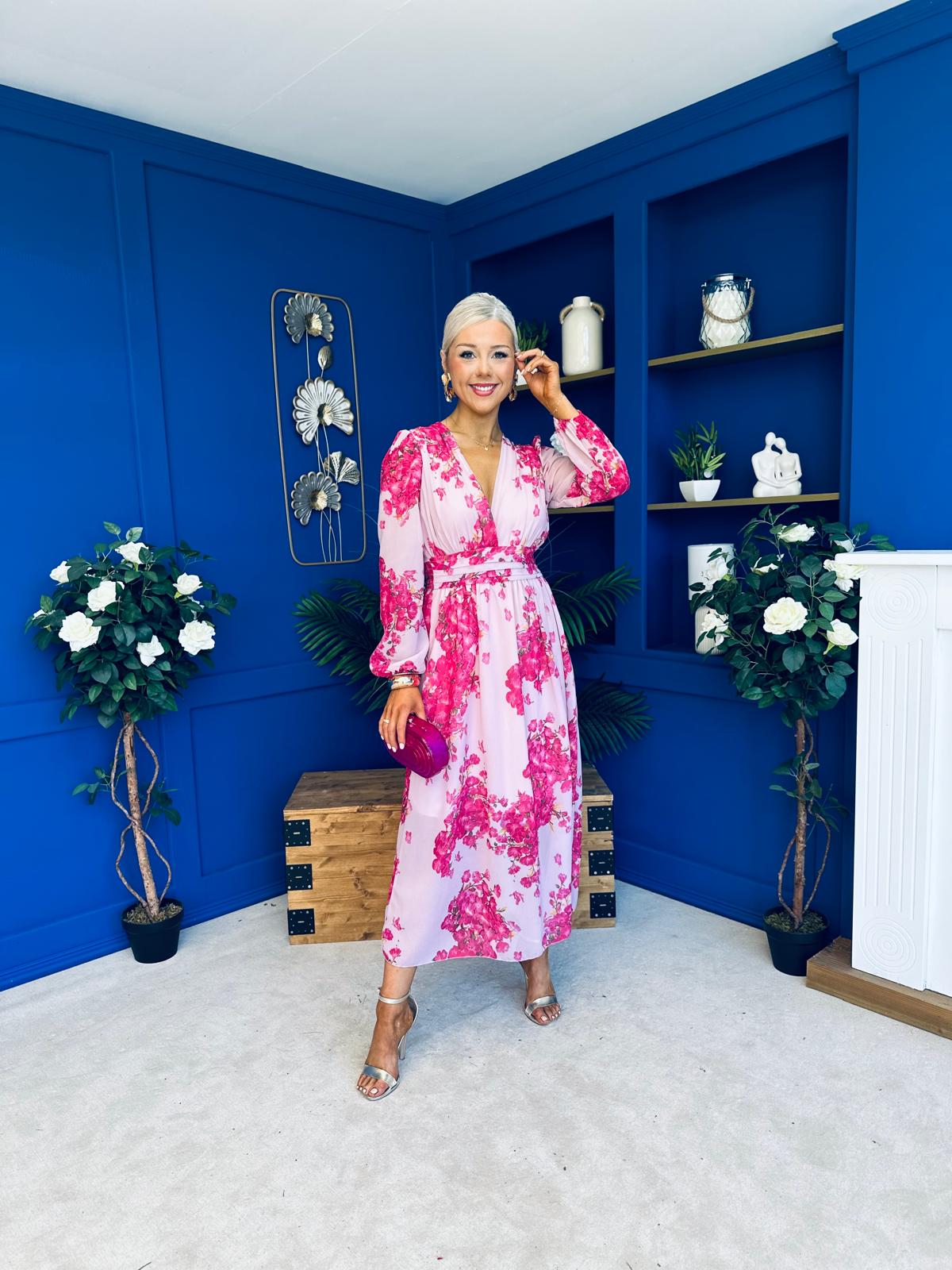 This occasion dress has a beautiful full sleeve, V neckline, pleated banded midriff, elasticated and flowing skirt for a statement silhouette and a flattering look, this dress will make you feel and look your best.
