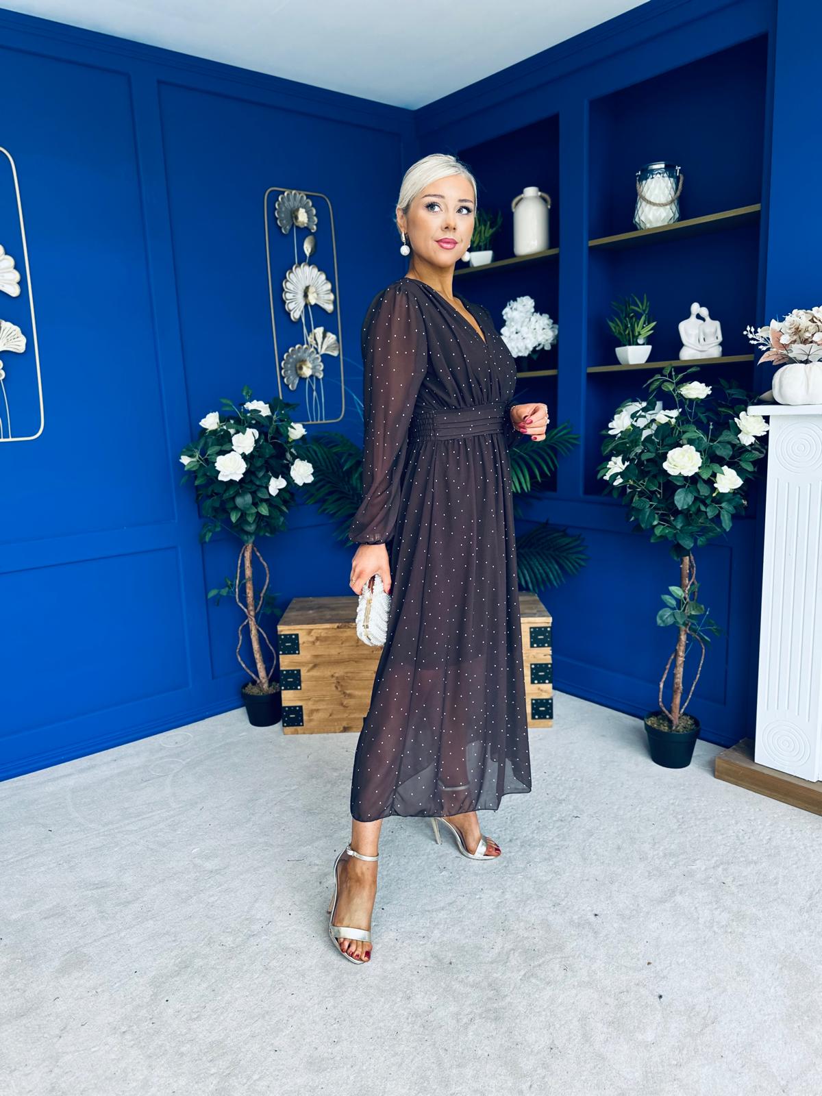 This occasion dress has a beautiful full sleeve, V neckline, pleated banded midriff, elasticated and flowing skirt for a statement silhouette and a flattering look, this dress will make you feel and look your best.