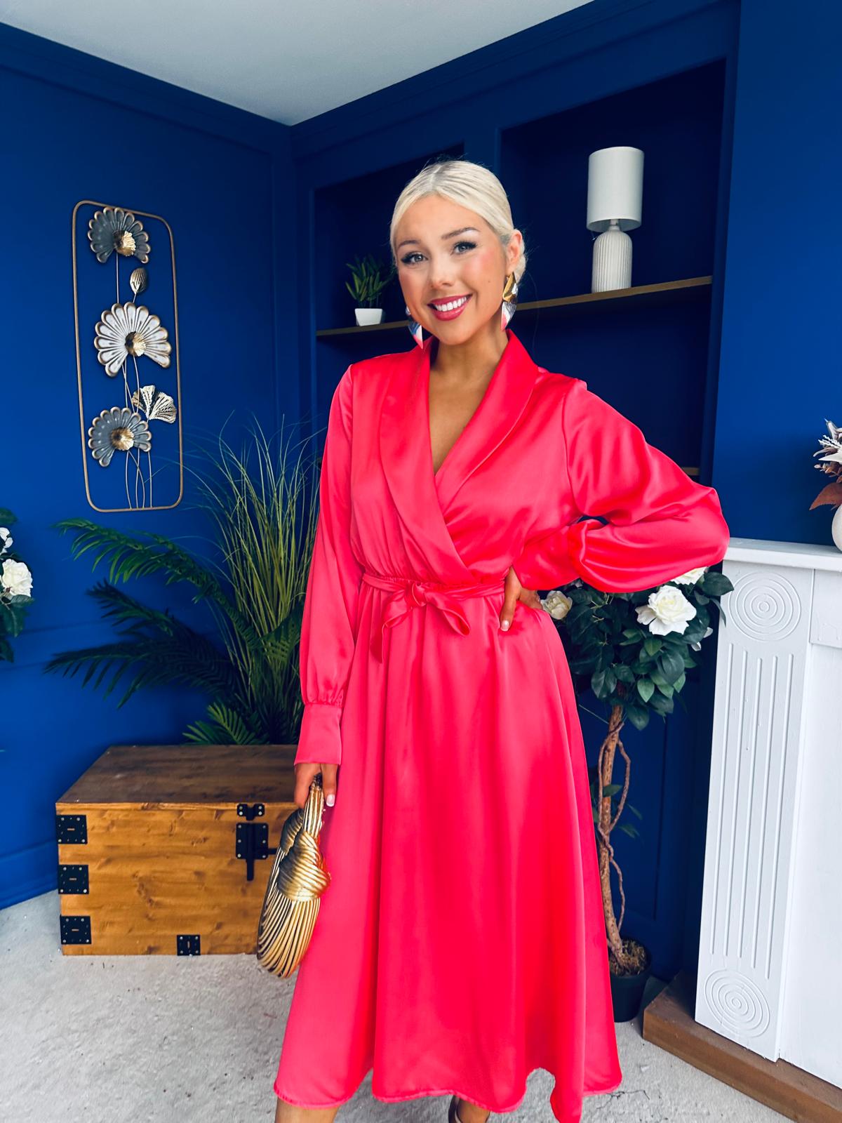 This dress has a beautiful cuffed full sleeve, lapel detailed wrap over neckline, elasticated waist with matching self tie belt and flowing skirt.