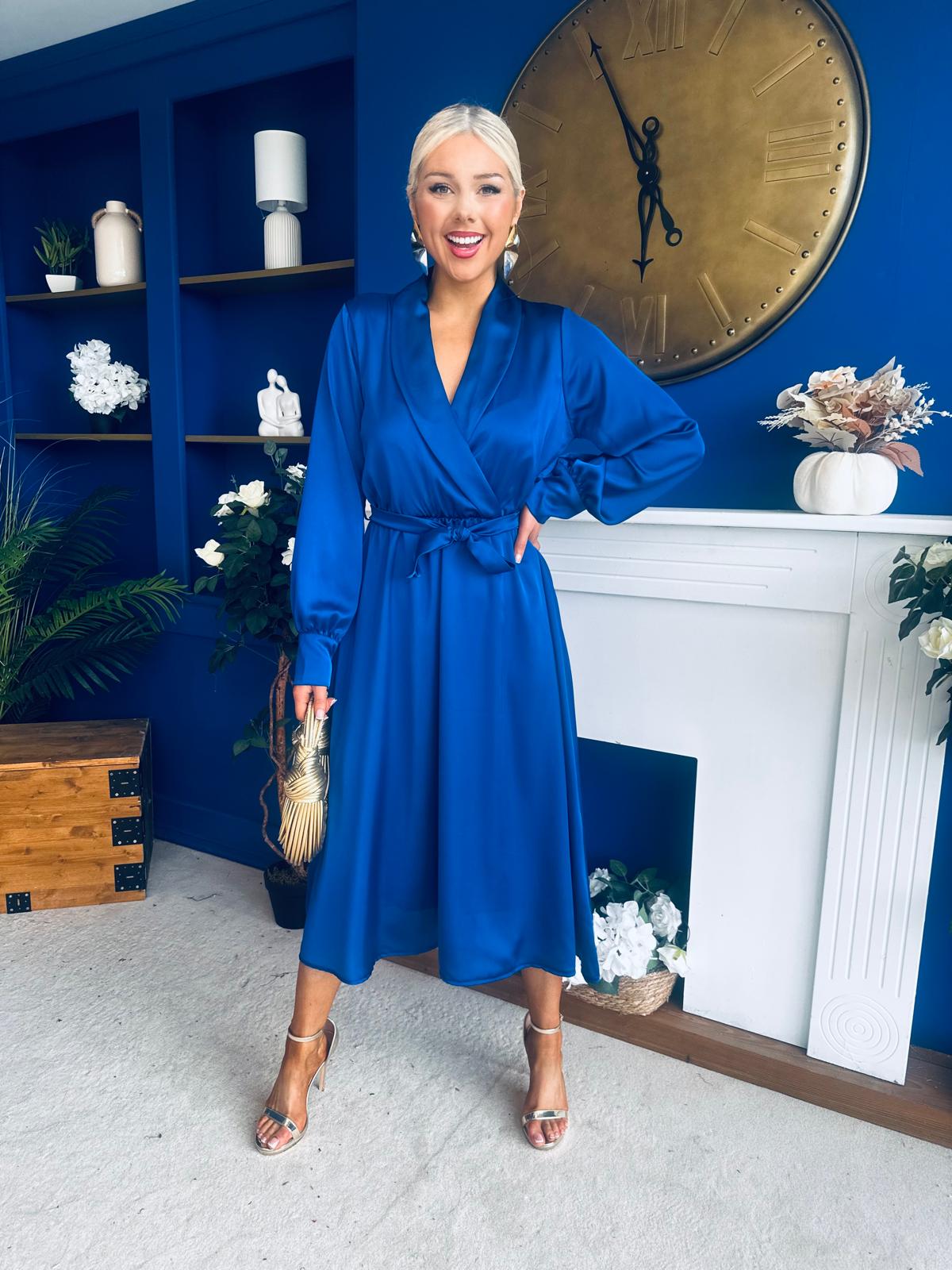 This dress has a beautiful cuffed full sleeve, lapel detailed wrap over neckline, elasticated waist with matching self tie belt and flowing skirt.