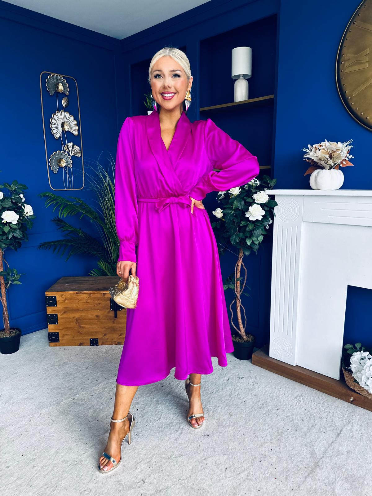 This dress has a beautiful cuffed full sleeve, lapel detailed wrap over neckline, elasticated waist with matching self tie belt and flowing skirt.