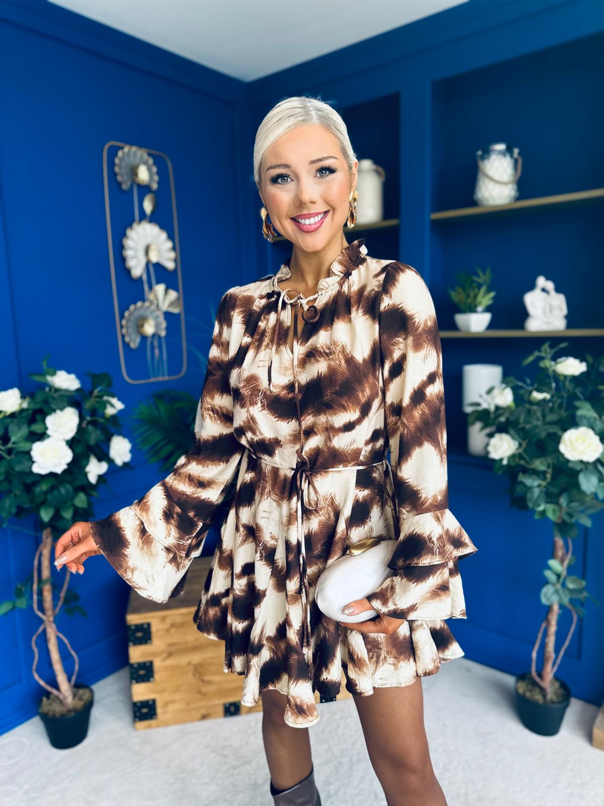 Its dramatic layered bell sleeve, detailed neckline, self tie string belt and flowing skirt create a stand out look