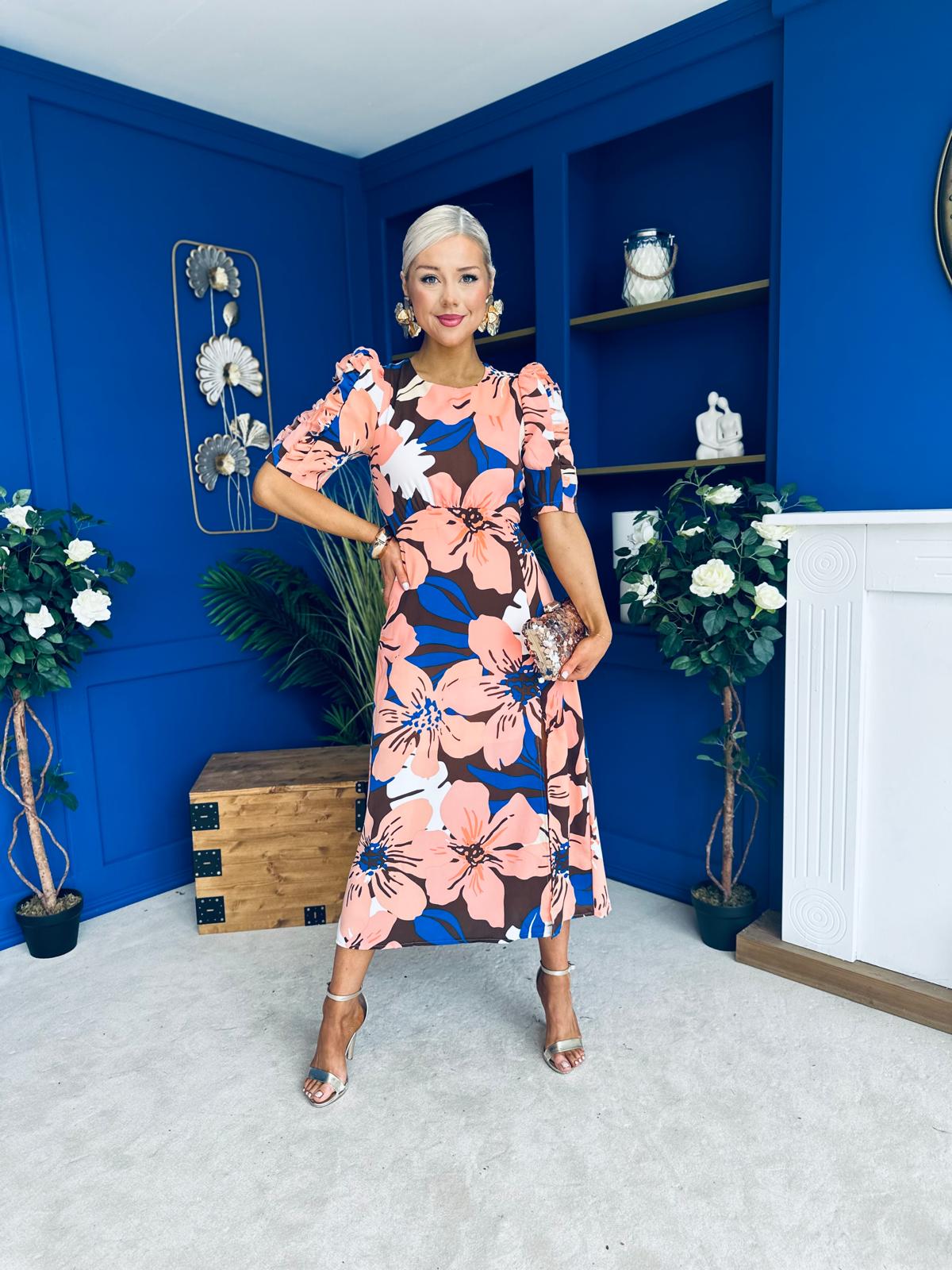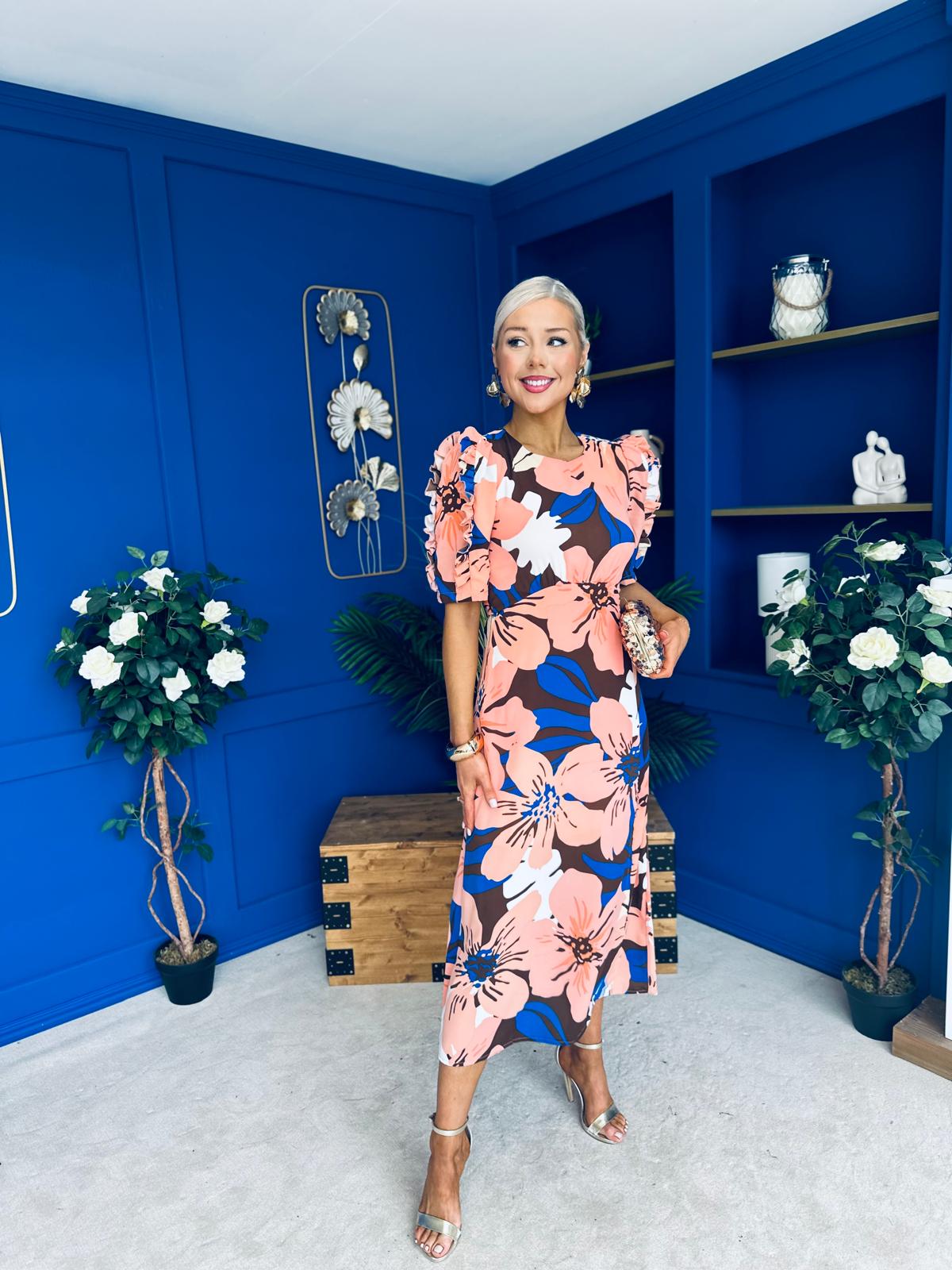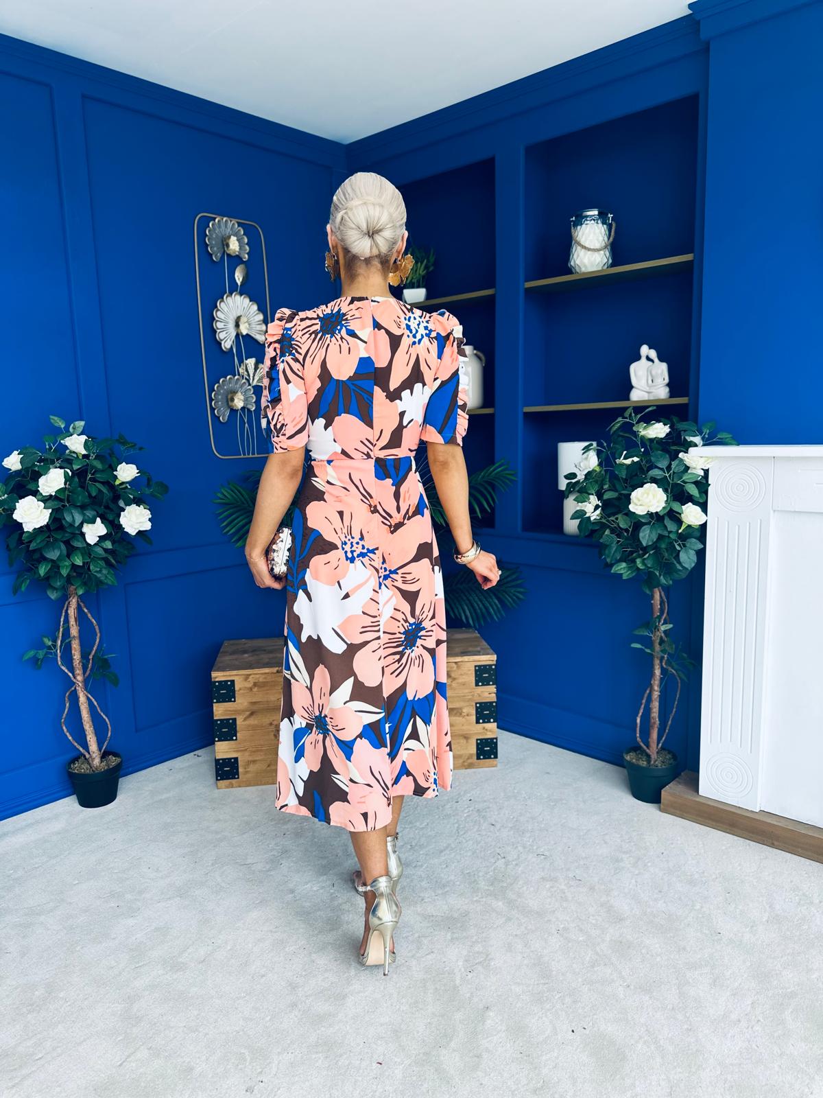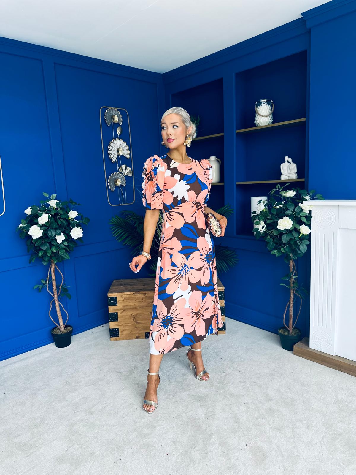 Samira Floral Frill Sleeve Midi Dress Brown Peach