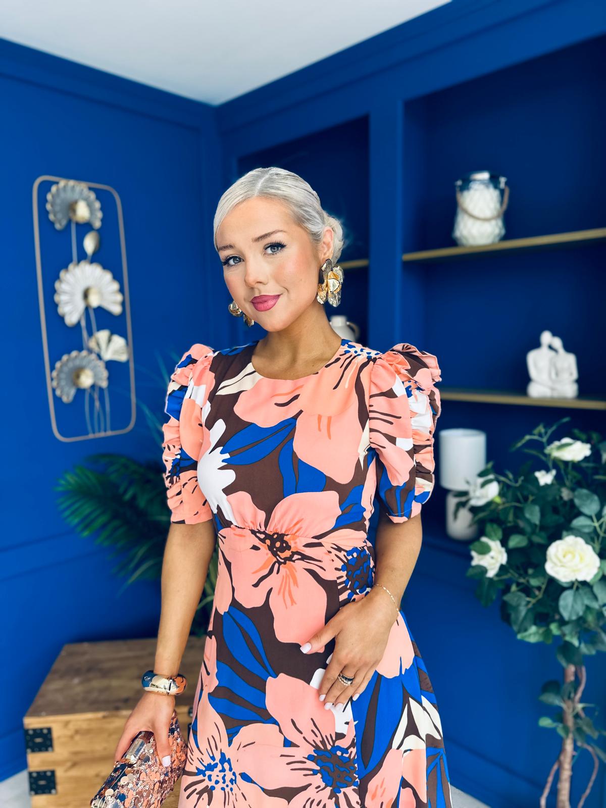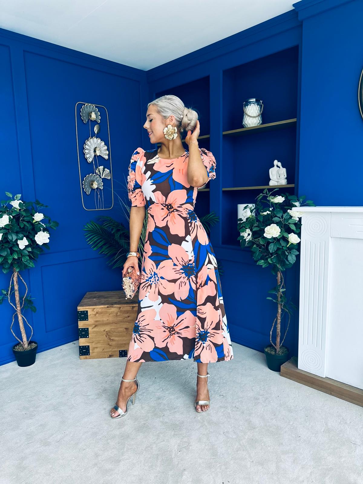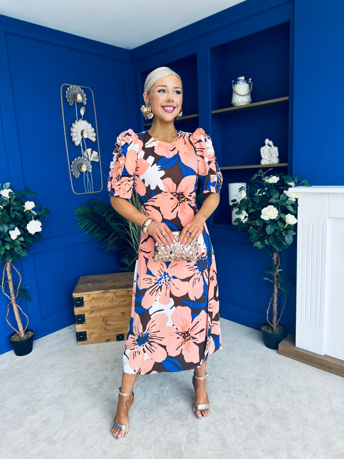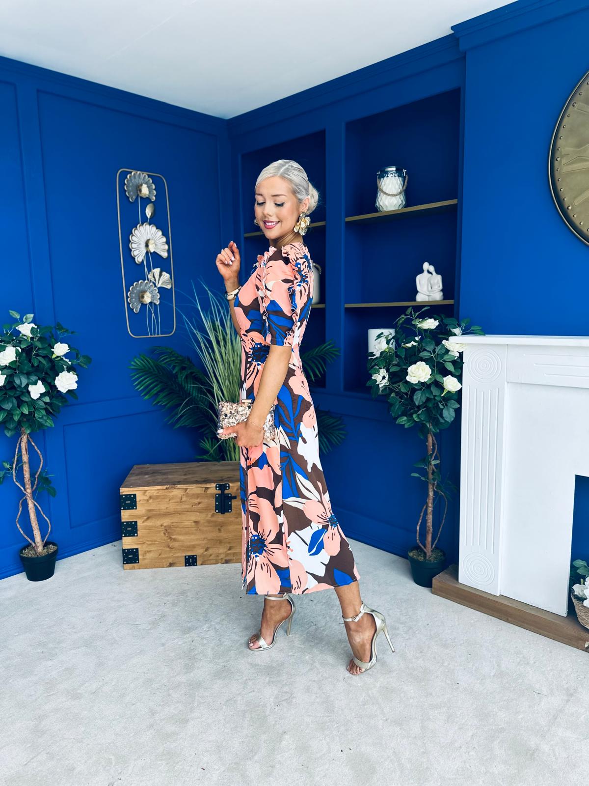 Samira Floral Frill Sleeve Midi Dress Brown Peach