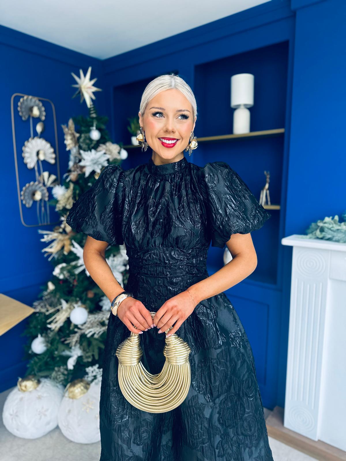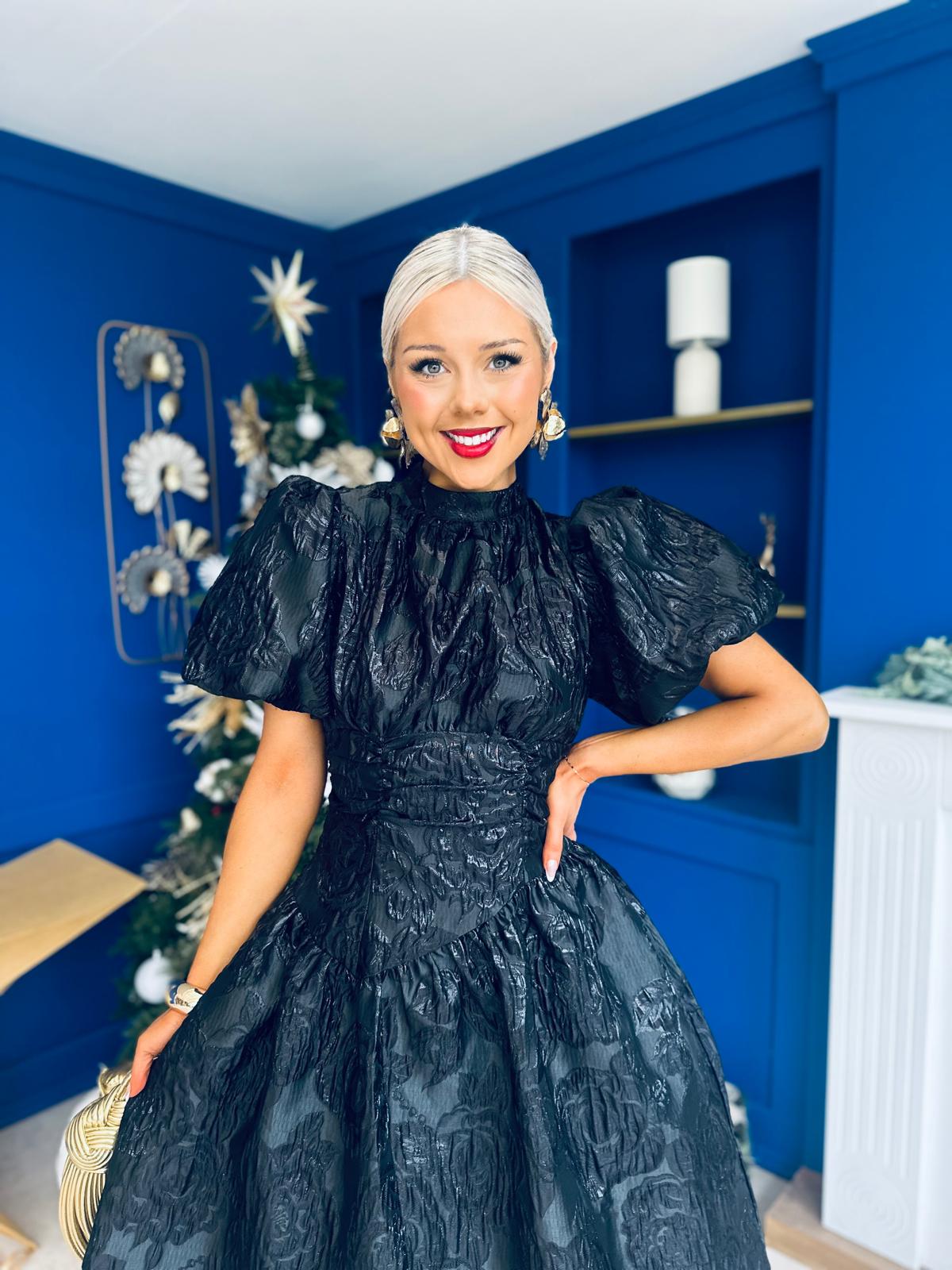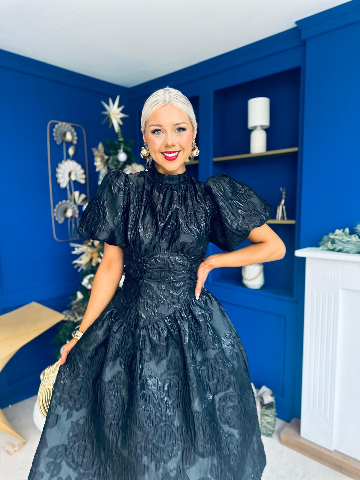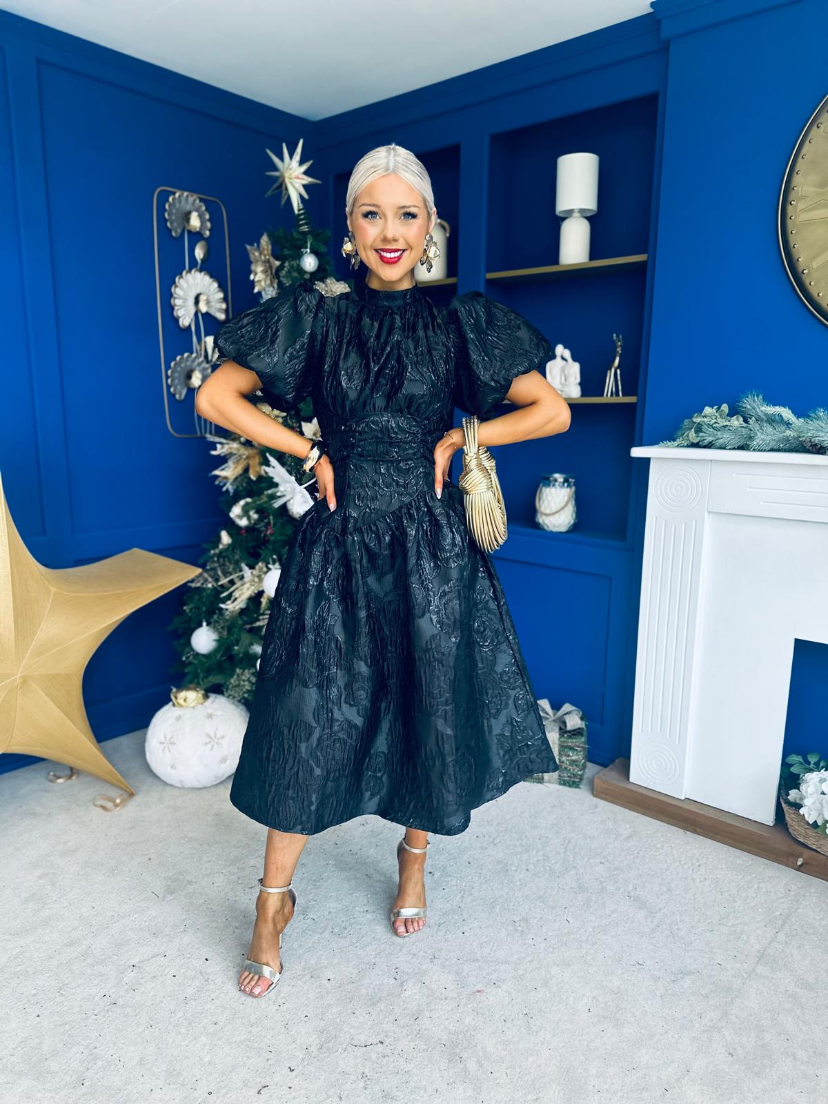 Sinead Puff Sleeve Jaquard Occasion Dress Black