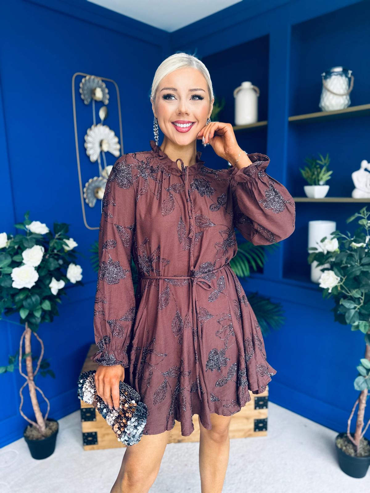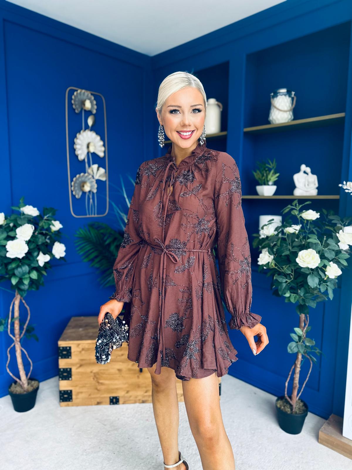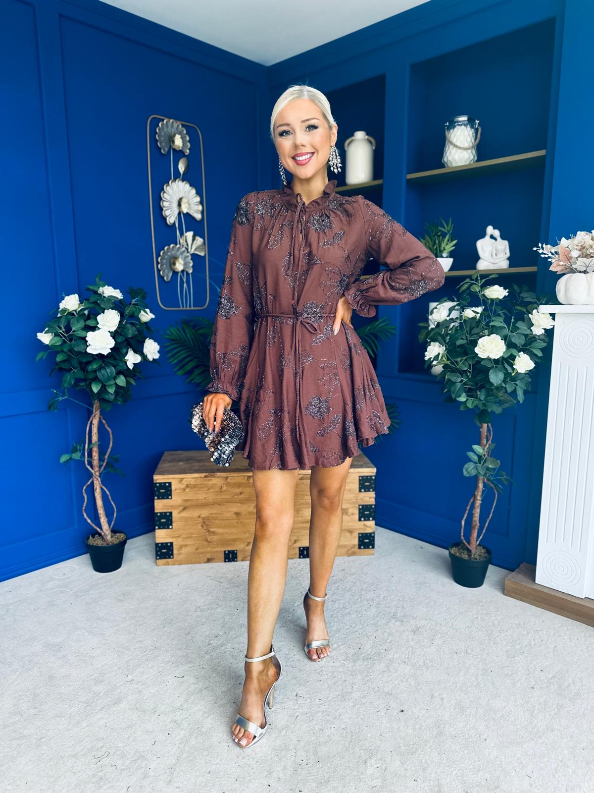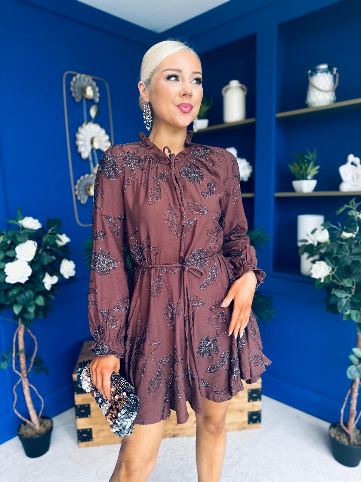 Stefi Embellished High Neck Mini Dress Chocolate