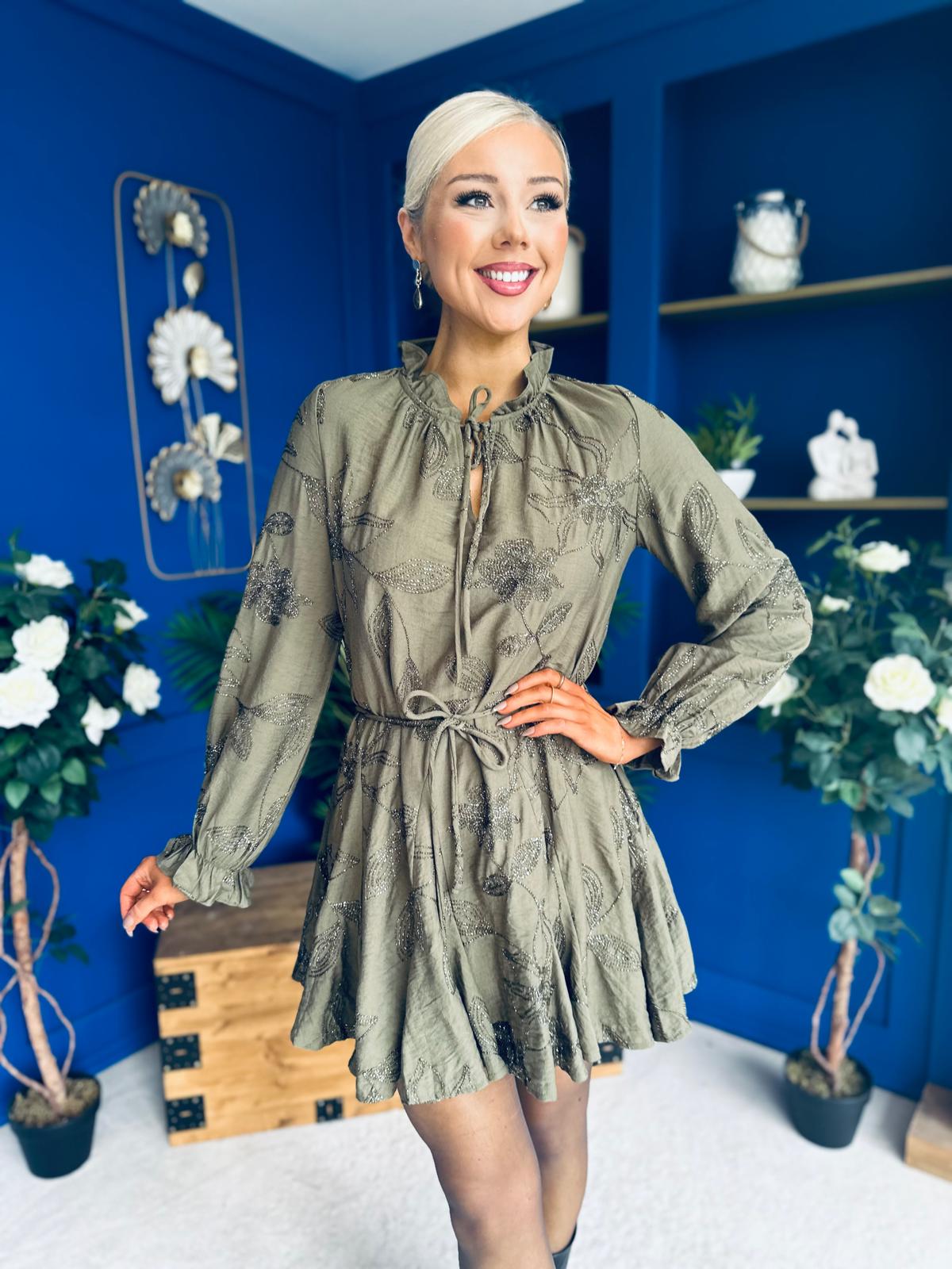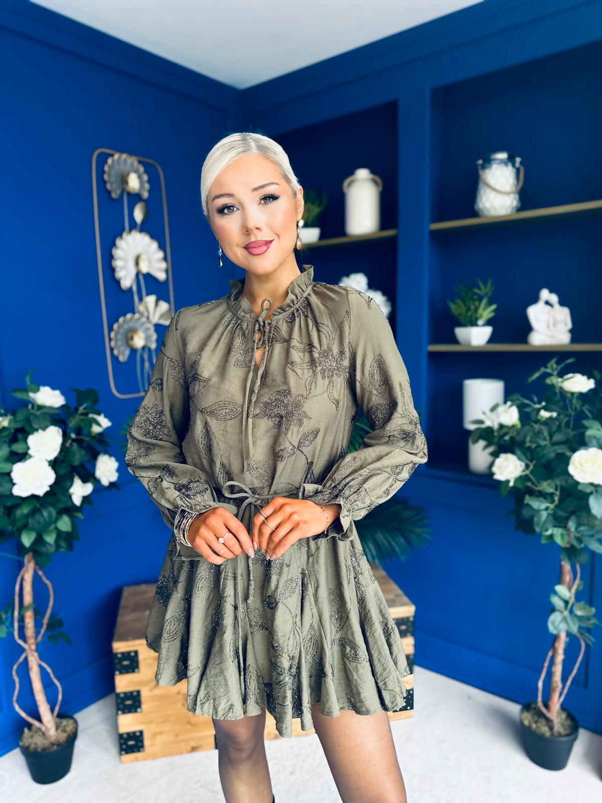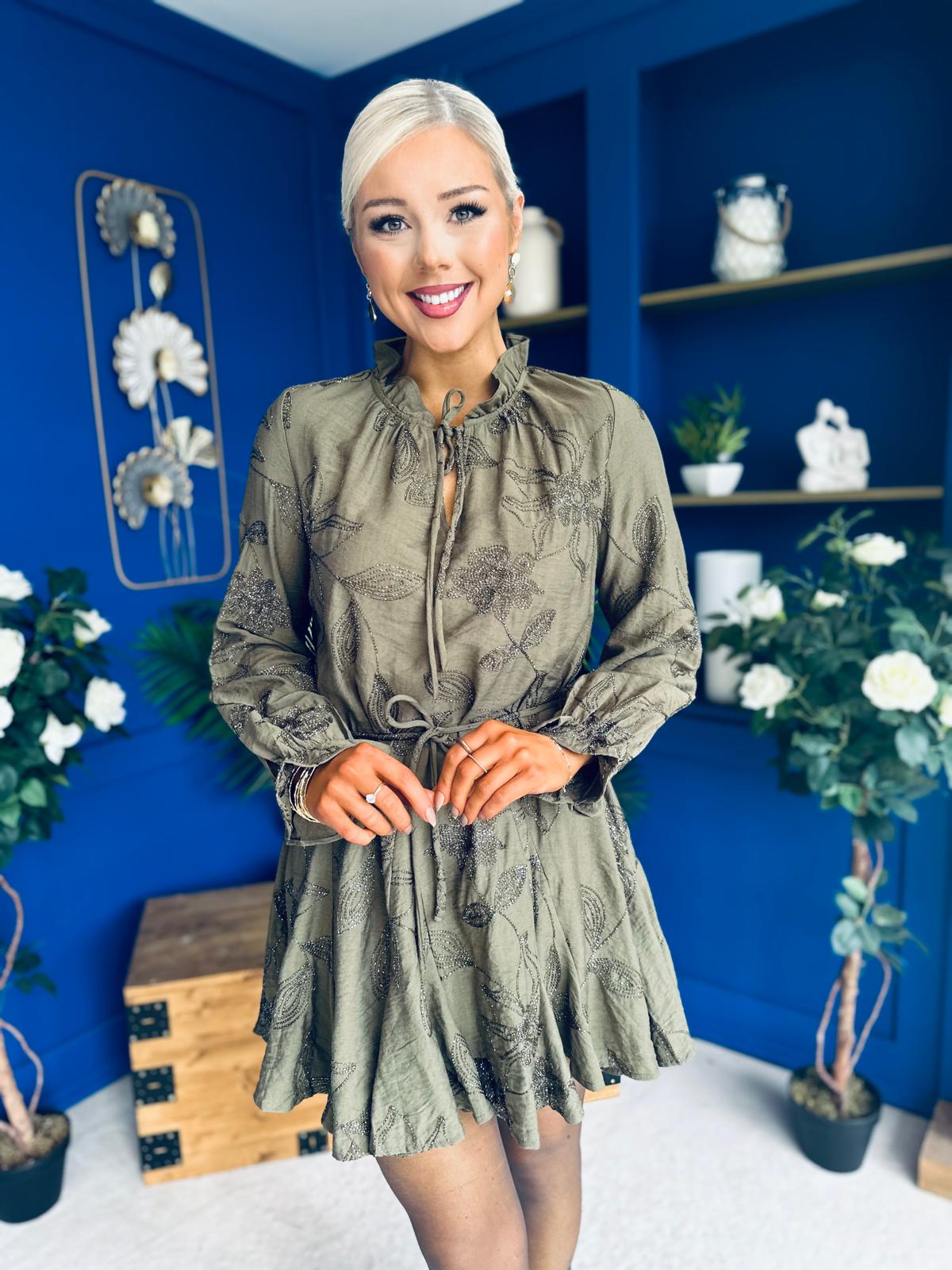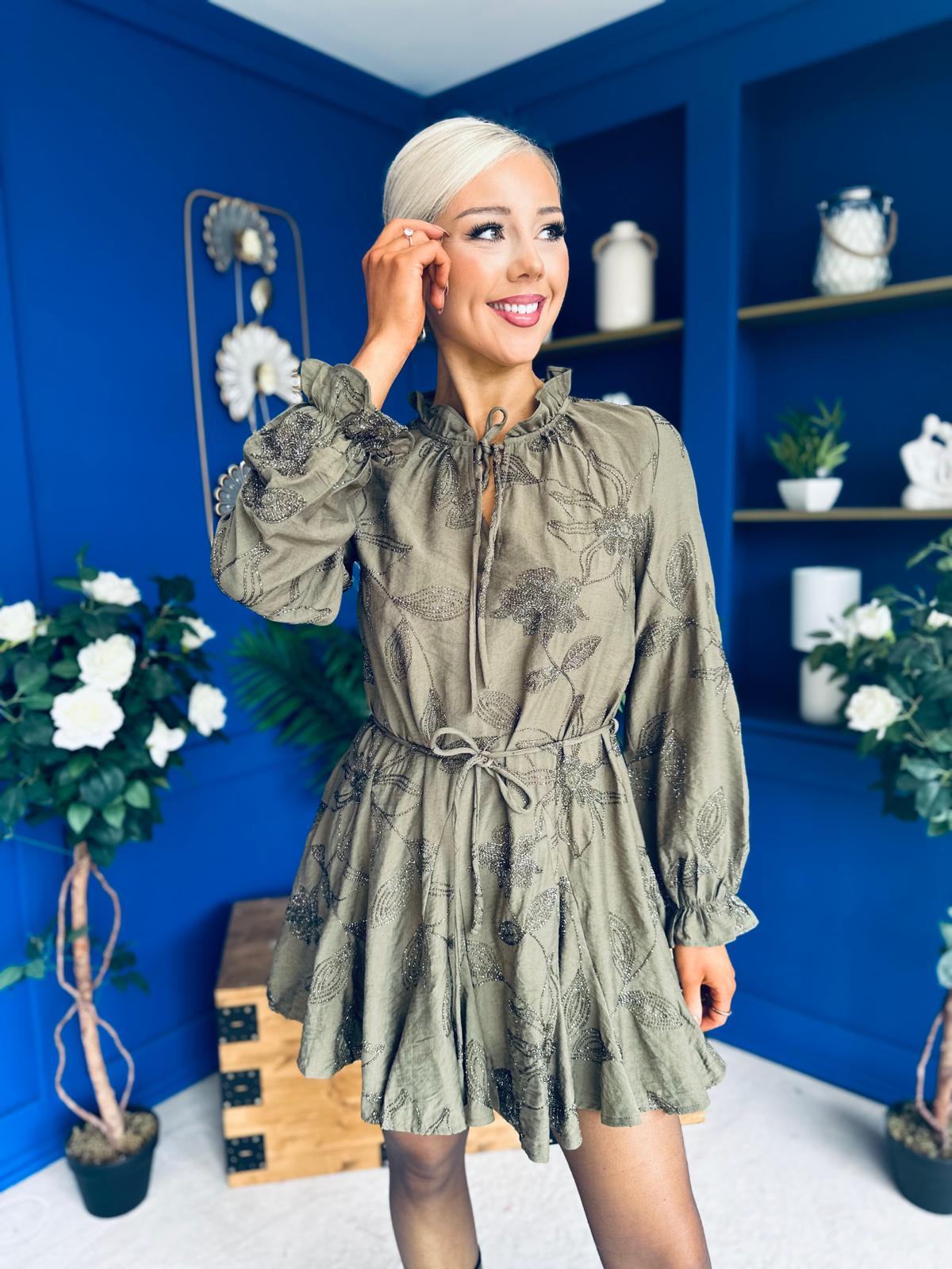 Stefi Embellished High Neck Mini Dress Khaki