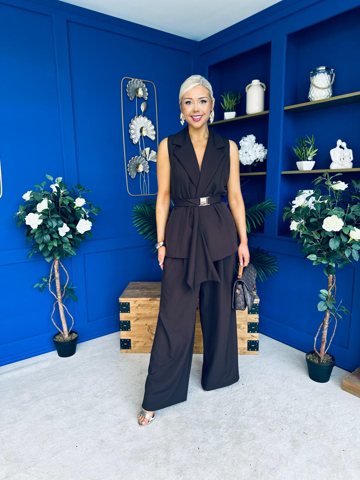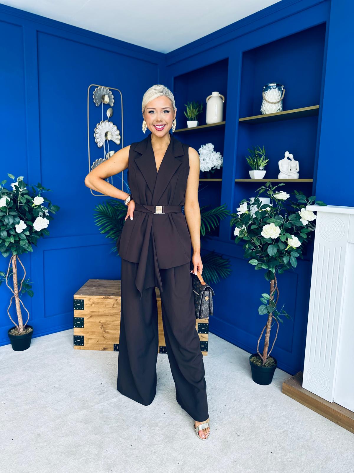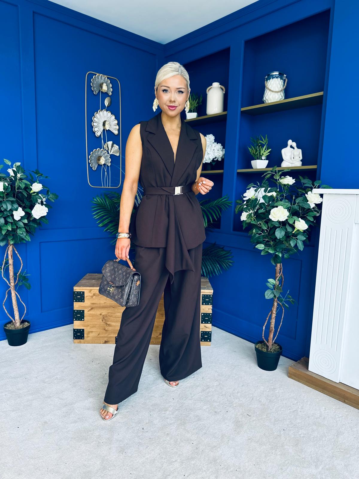 The sophisticated and exclusive design features a tailored waistcoat with matching belt and drape detail. The matching wide leg trousers make for a luxurious and chic look.