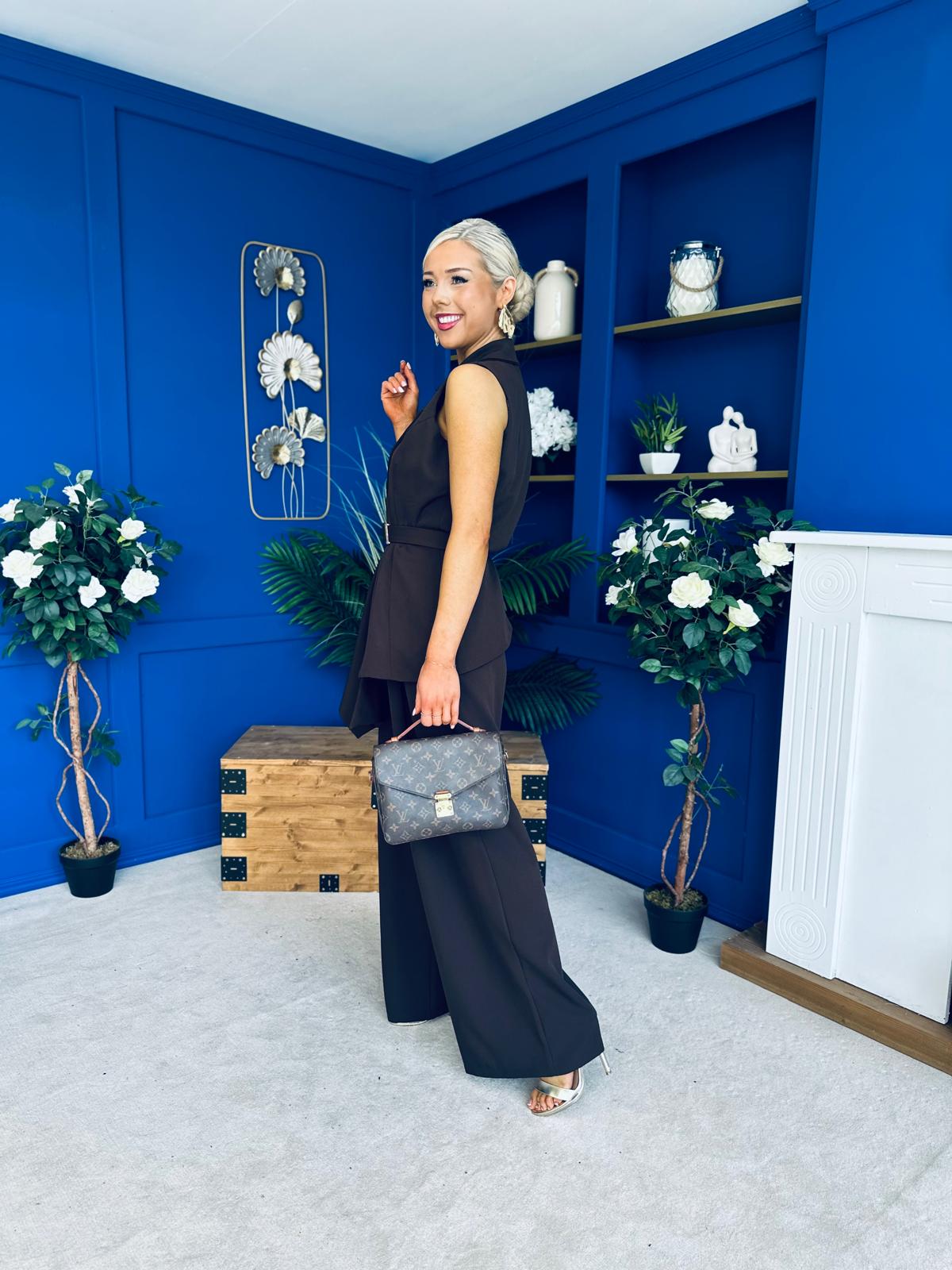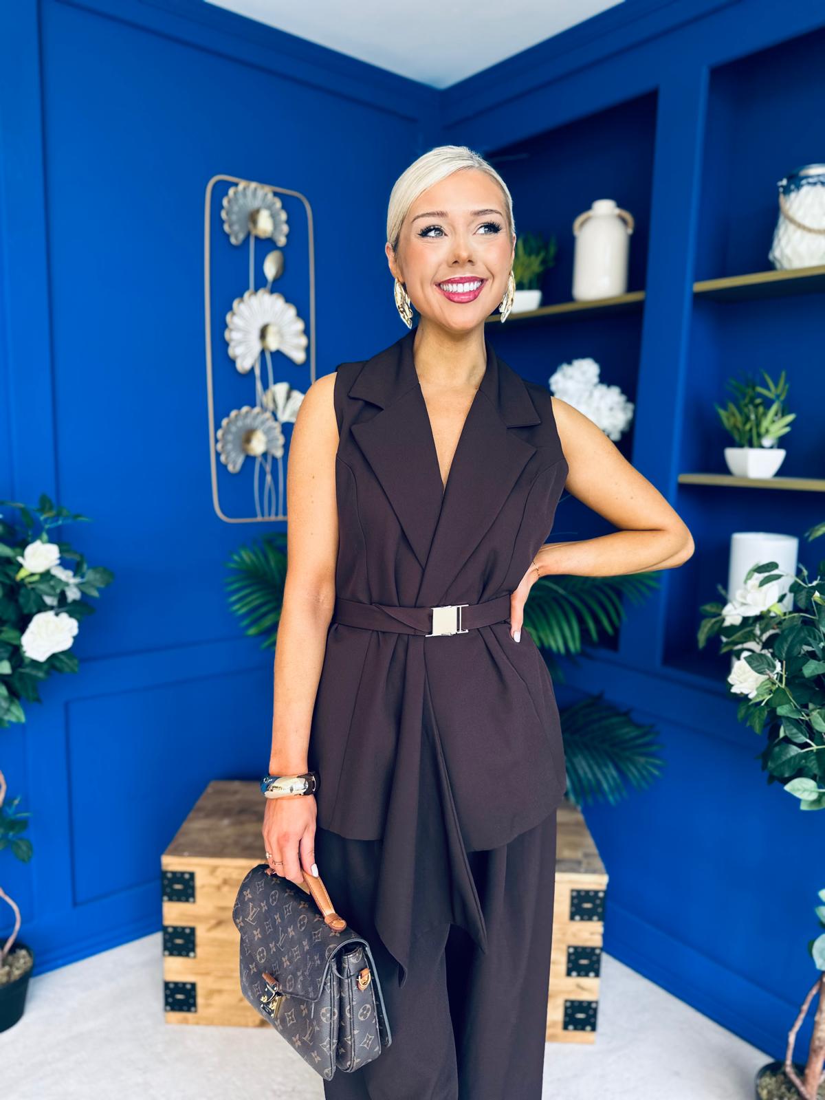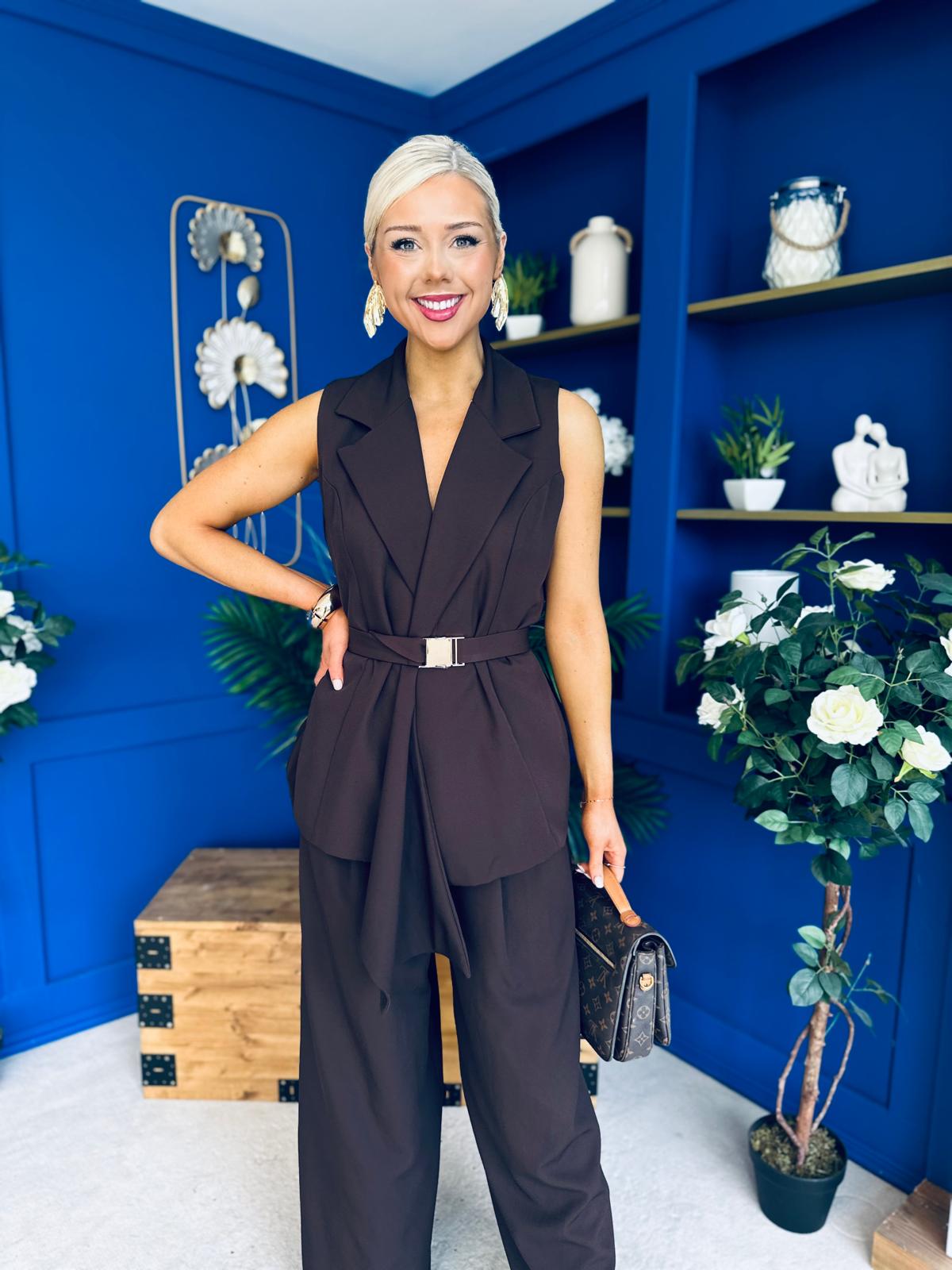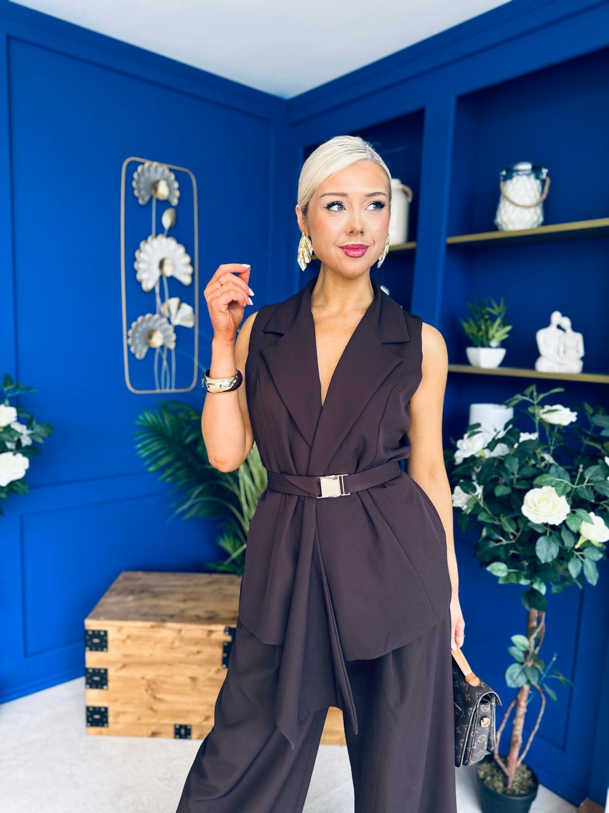 The sophisticated and exclusive design features a tailored waistcoat with matching belt and drape detail. The matching wide leg trousers make for a luxurious and chic look.