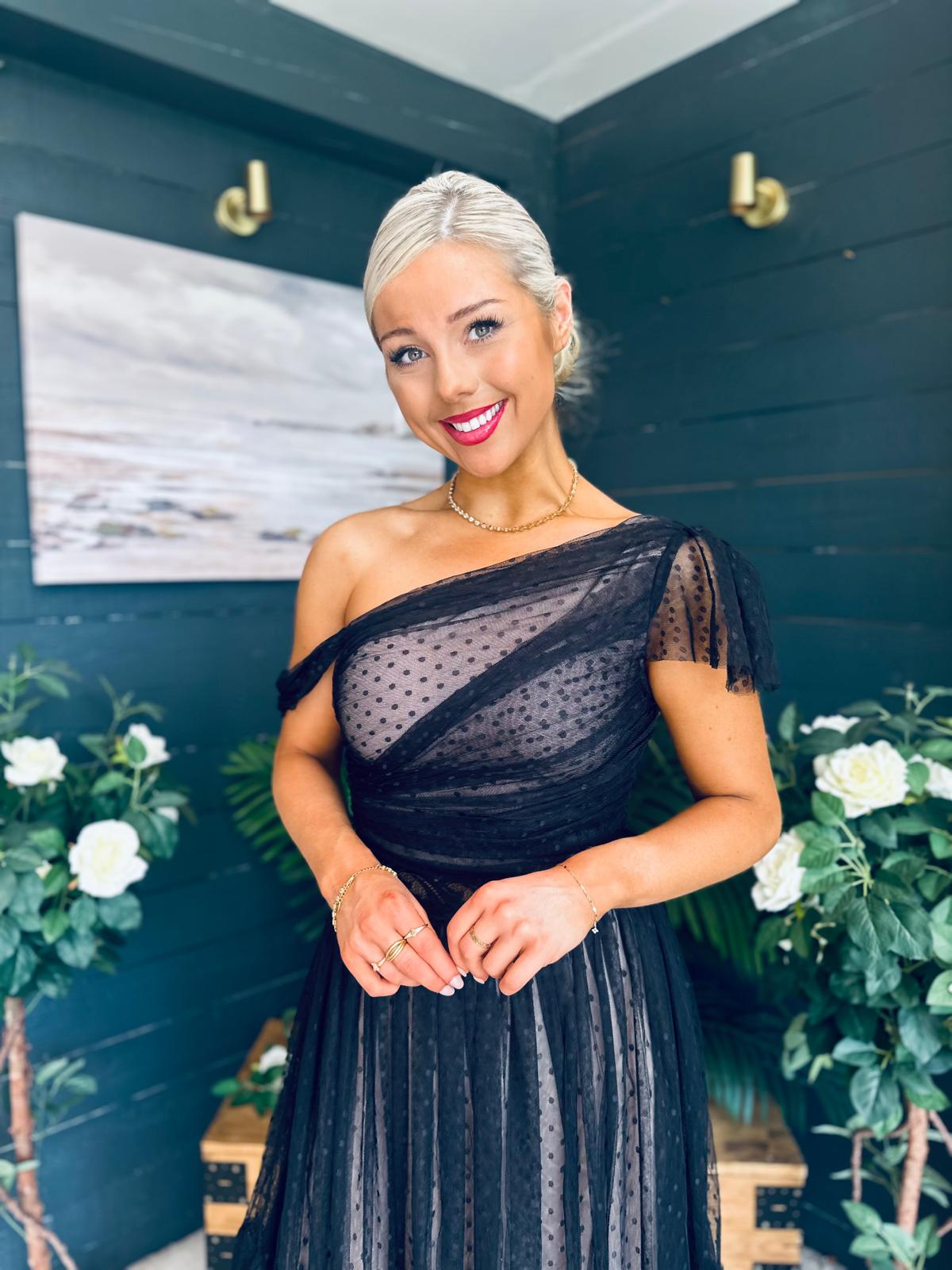 We are loving this flowing midi dress with gorgeous neckline and flowing tulle skirt.