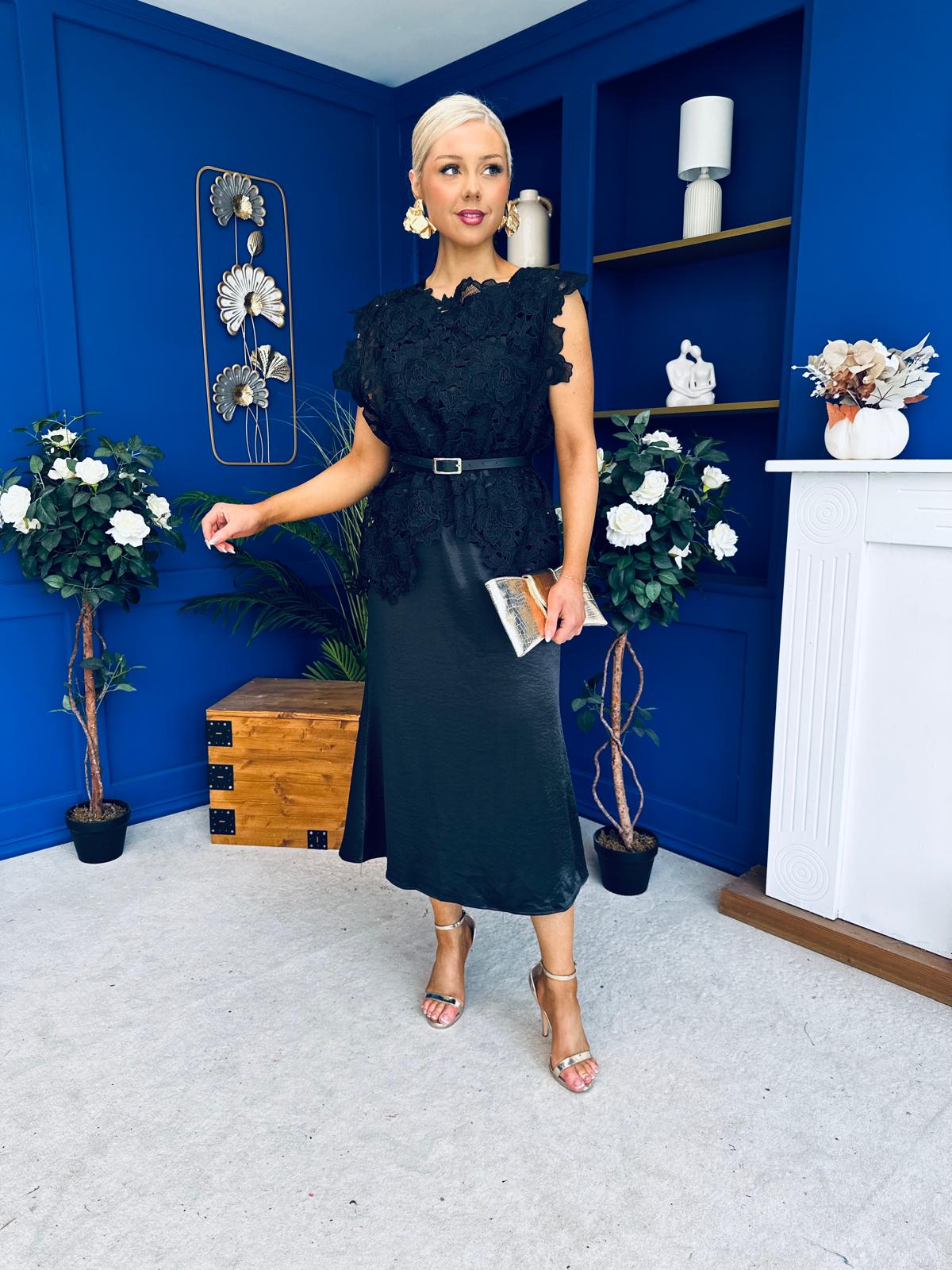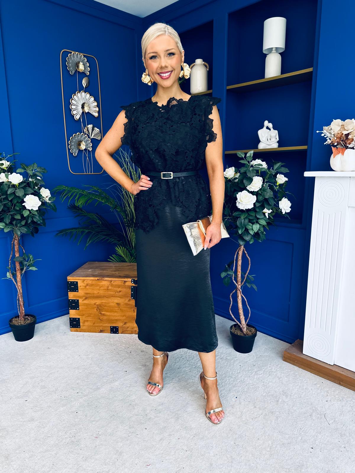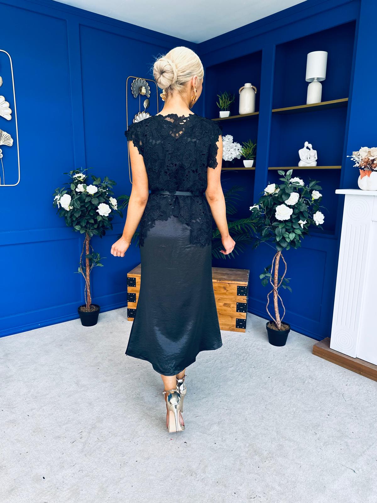 Tara Crochet Top & Satin Dress Set Black