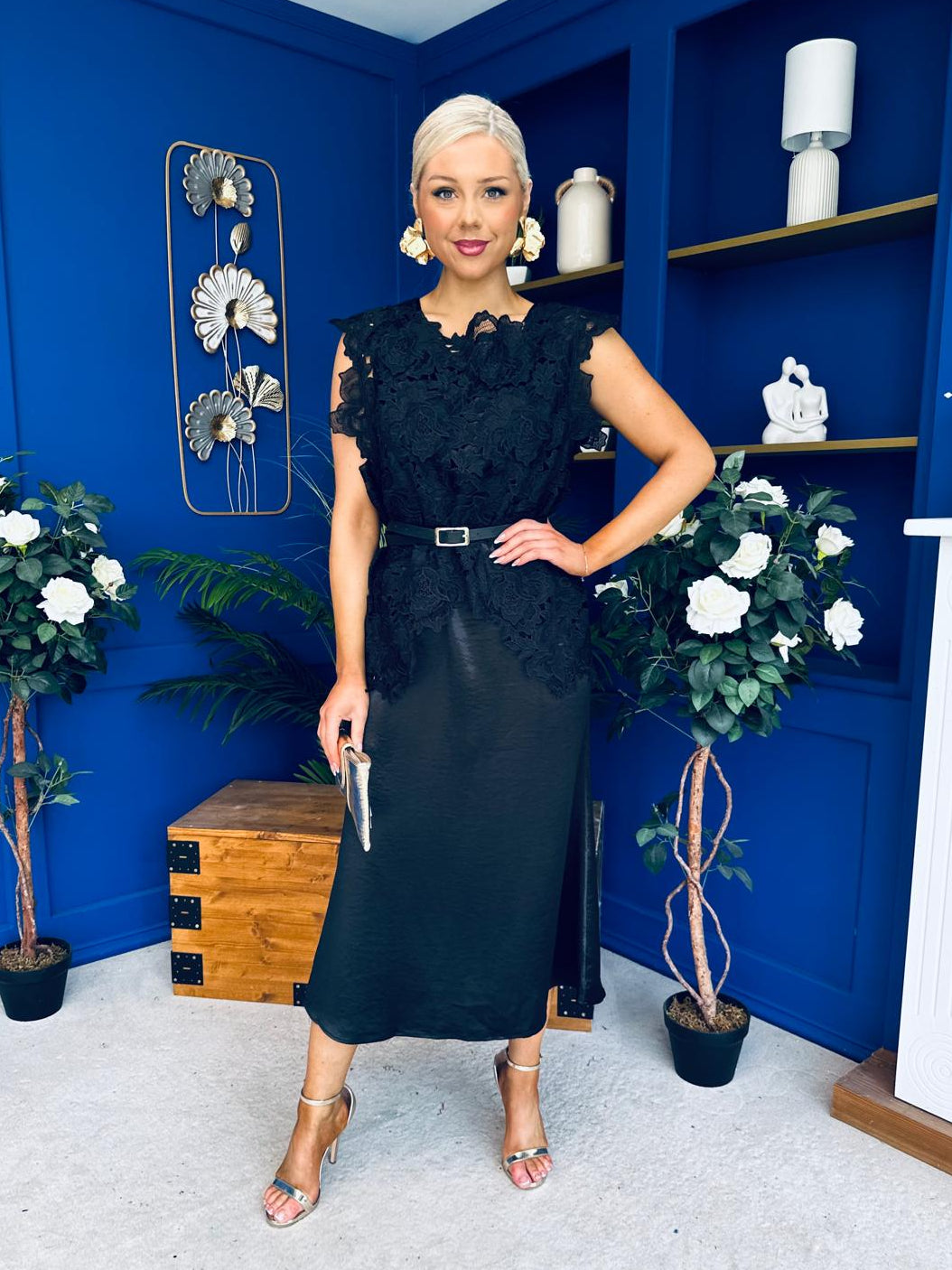 The stand out pull over crochet top, matching belt and flowing satin dress are sure to make an entrance at any occasion day or night