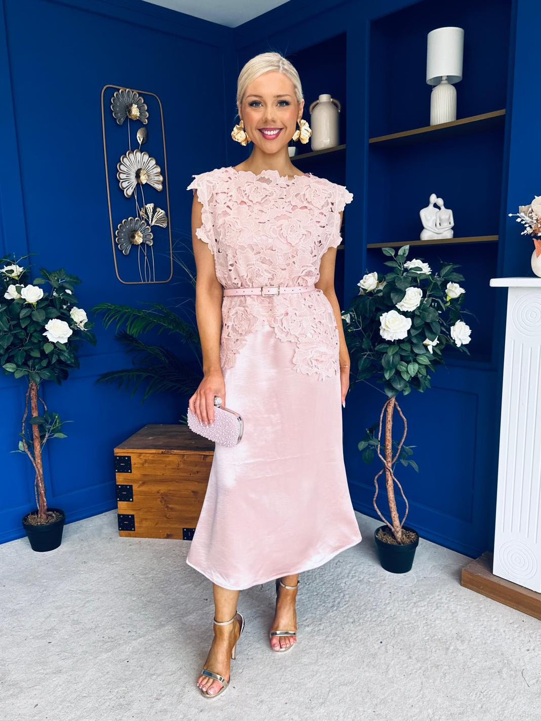 The stand out pull over crochet top, matching belt and flowing satin dress are sure to make an entrance at any occasion day or night