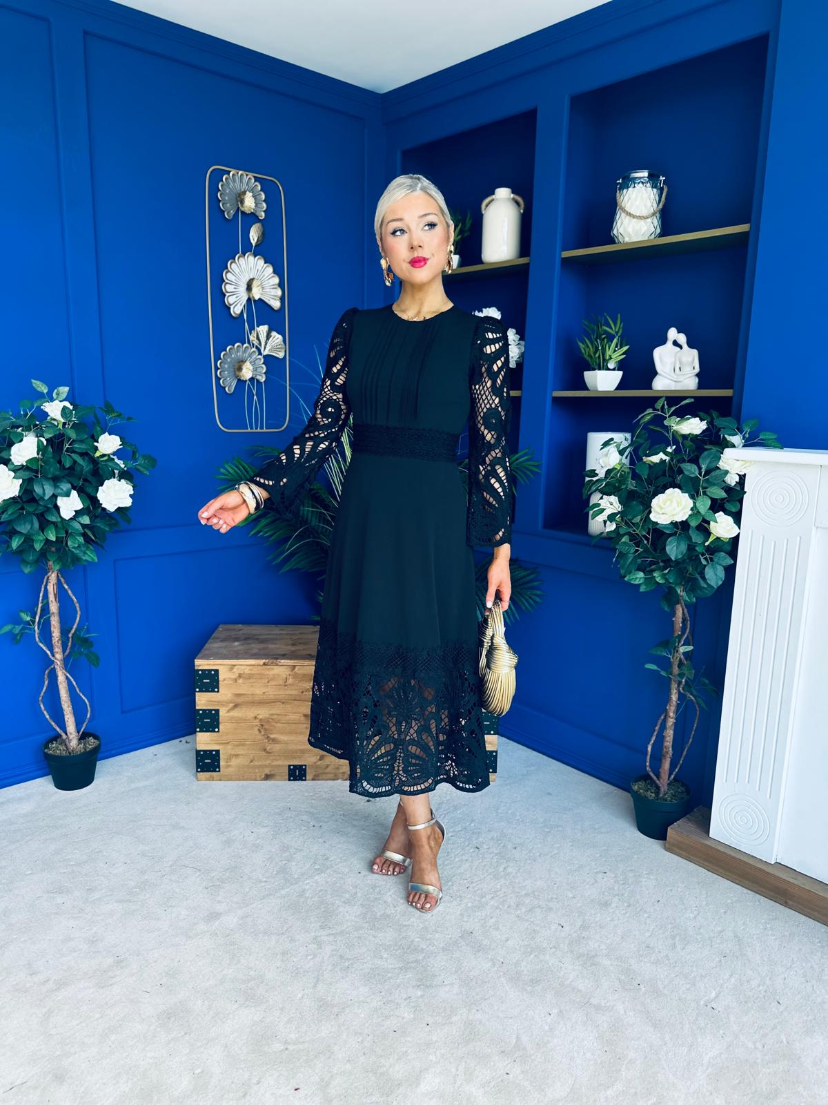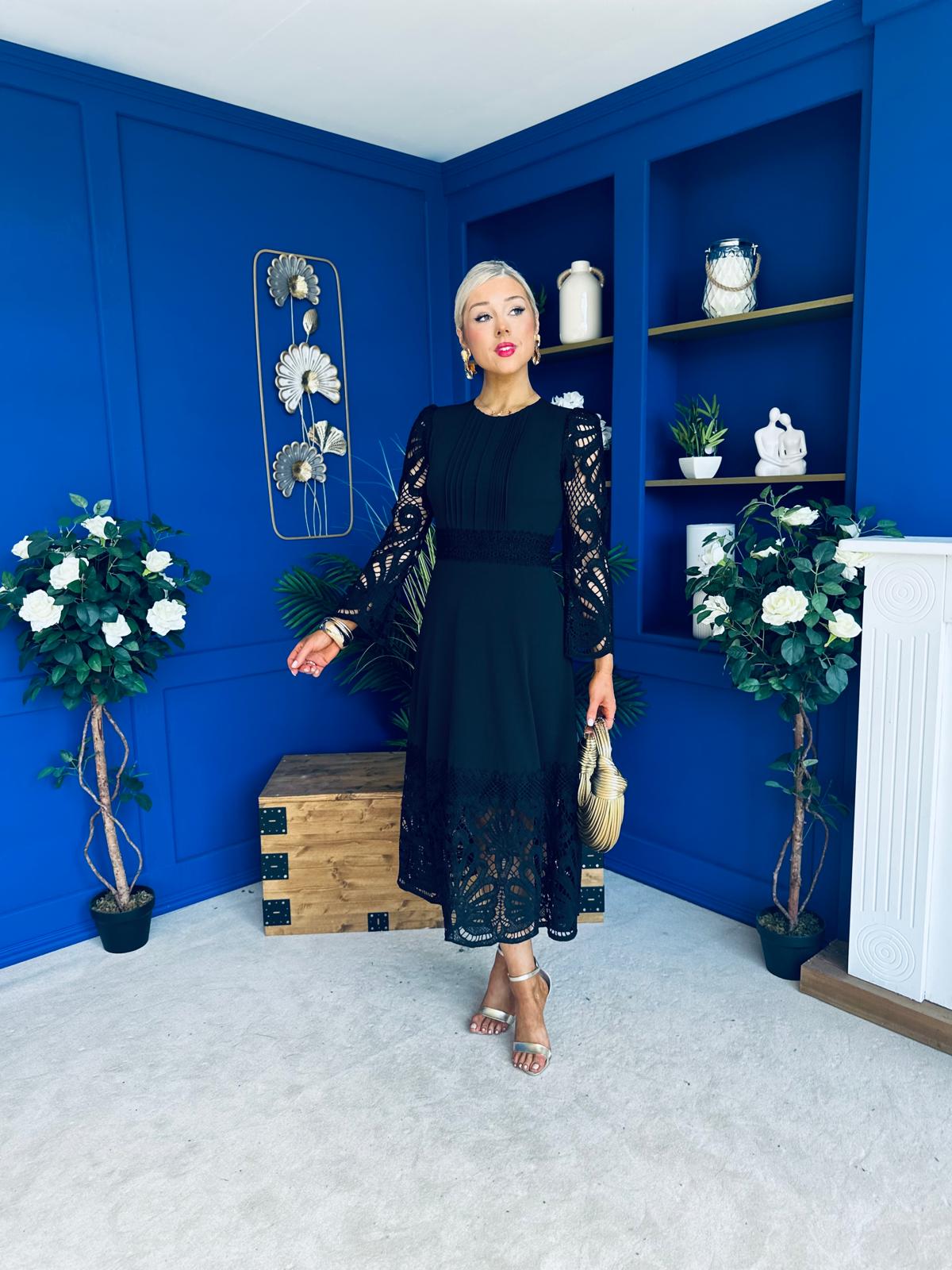 With a gorgeous neckline, crochet detail, full detailed sleeve and flowing detailed skirt.