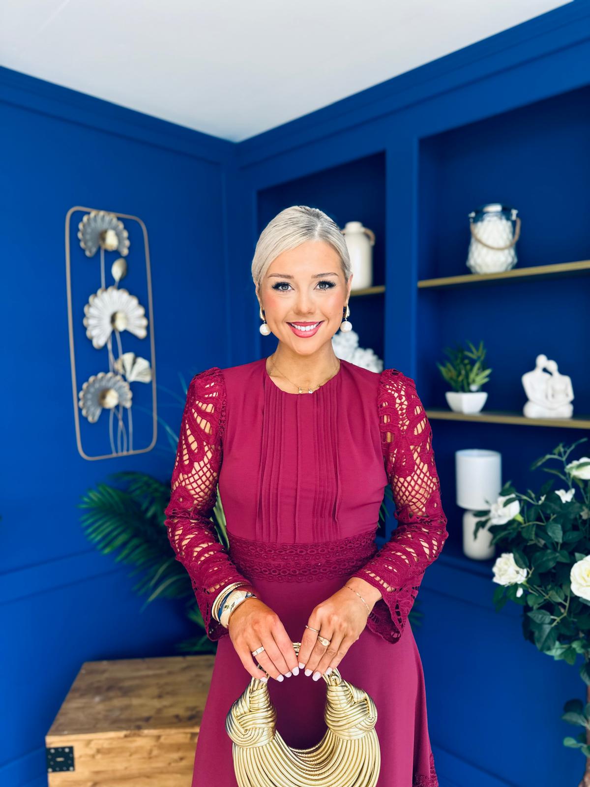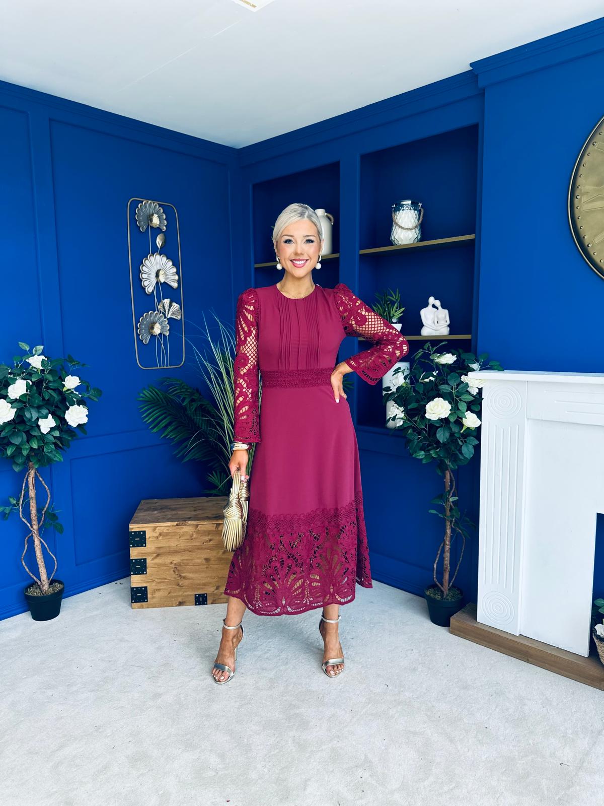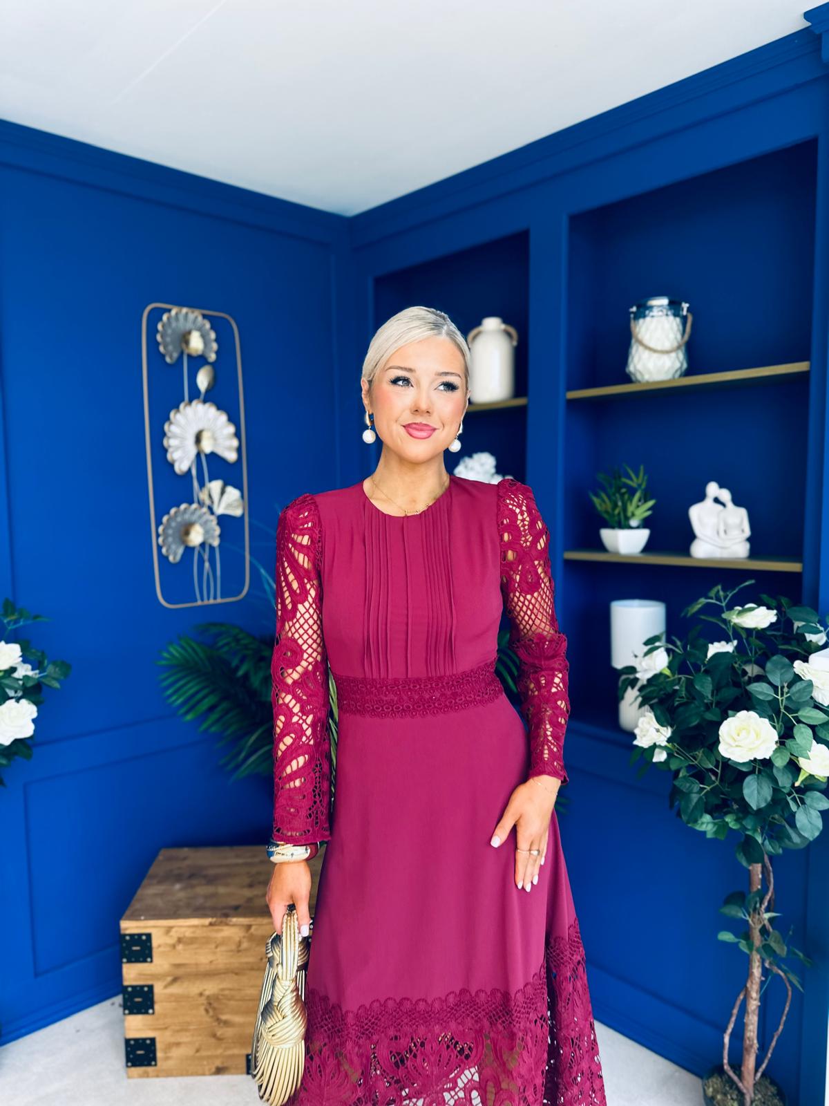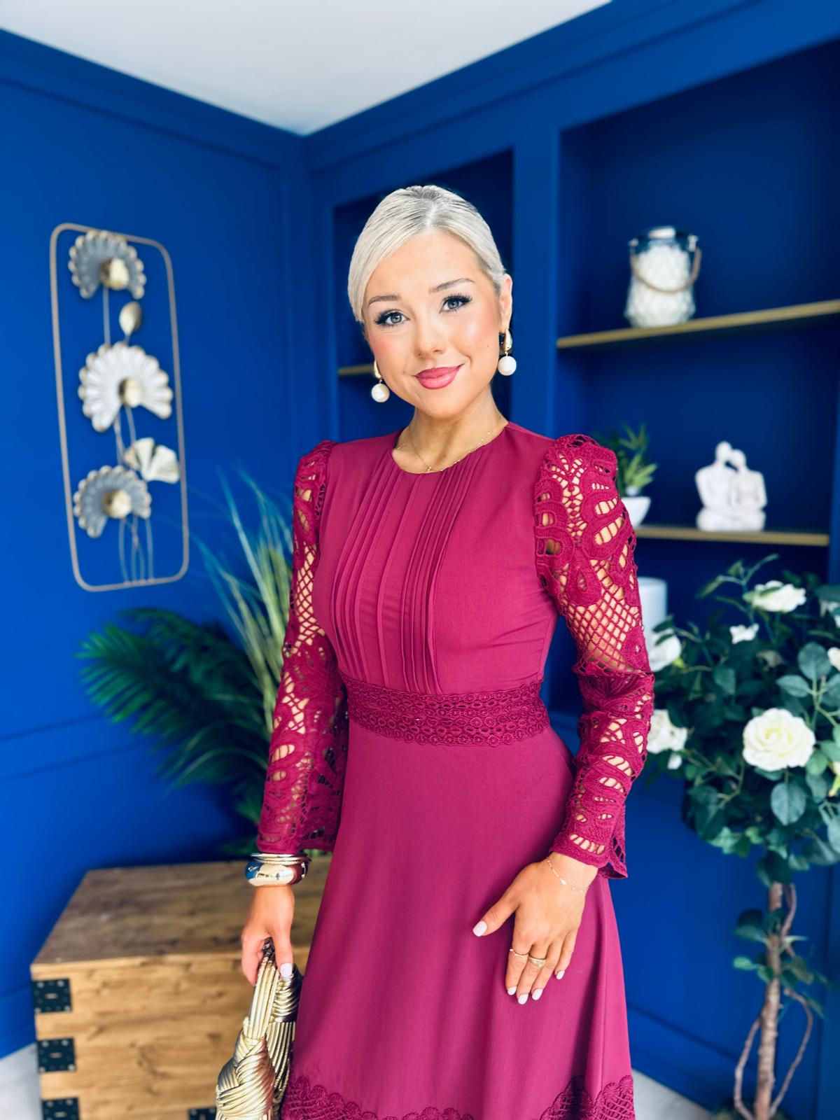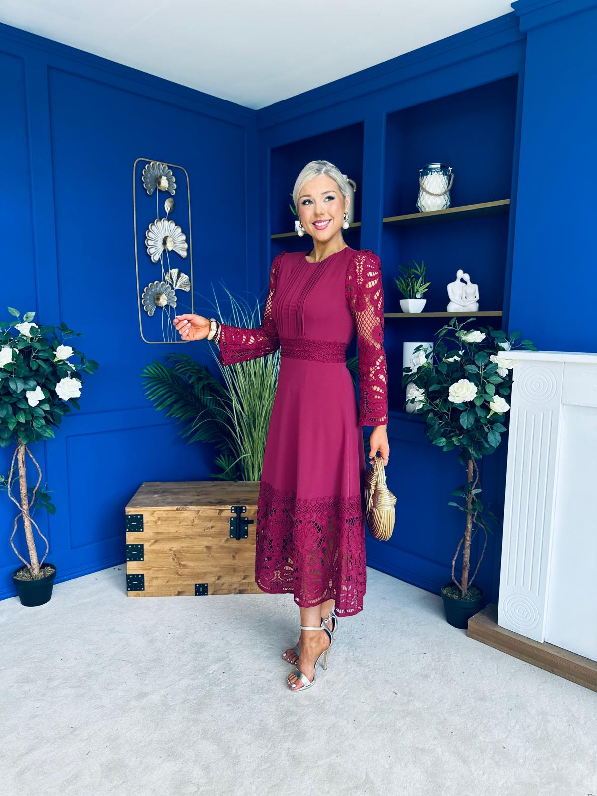 With a gorgeous neckline, crochet detail, full detailed sleeve and flowing detailed skirt.