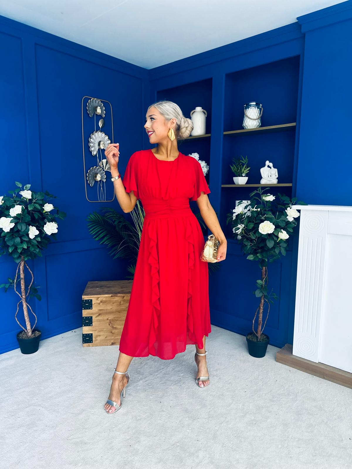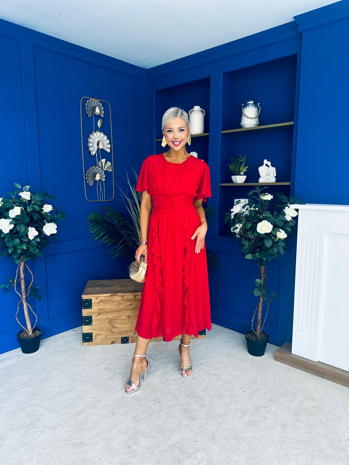 This dress comes in the most amazing lined chiffon, with beautiful sleeve detail, ruched bust, banded midriff, elasticated back to cinch and flowing skirt with frill detail to flatter