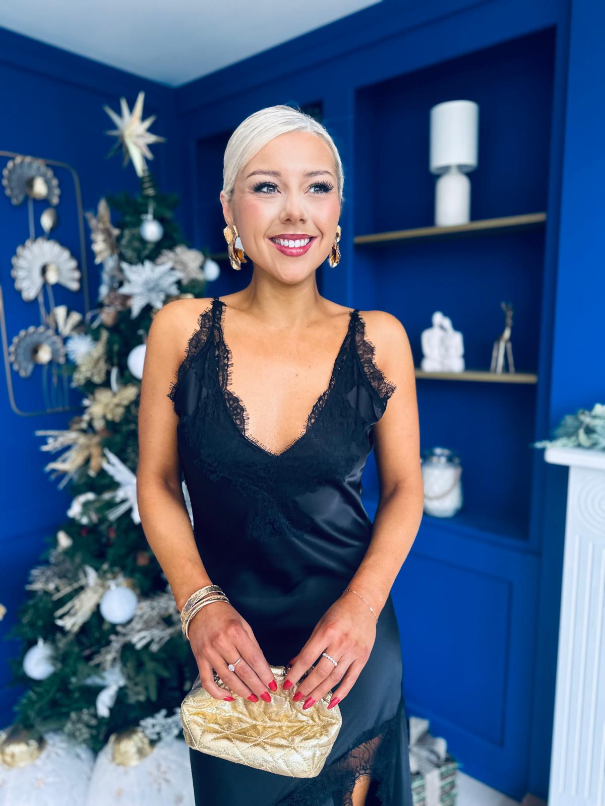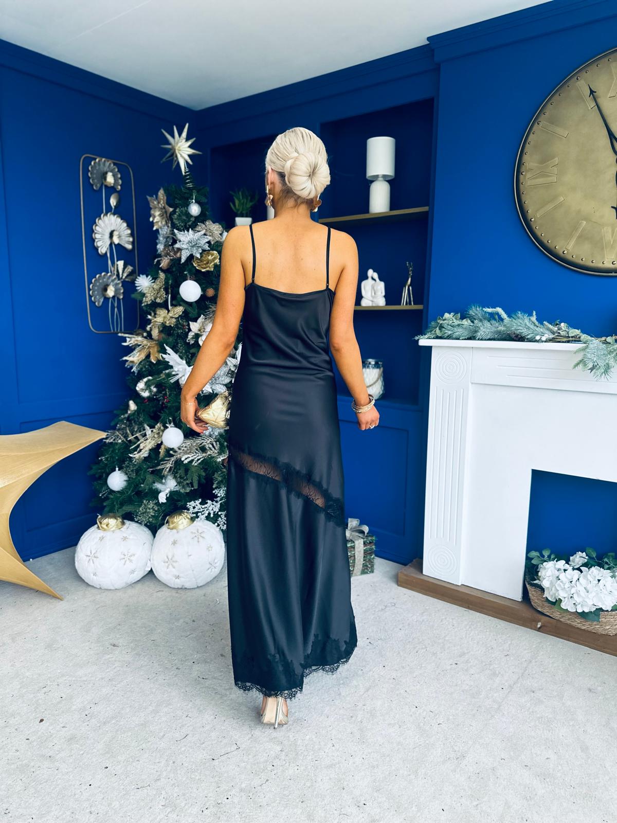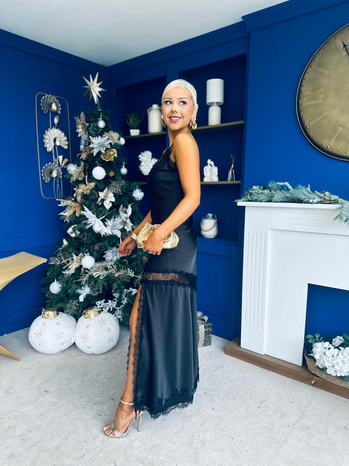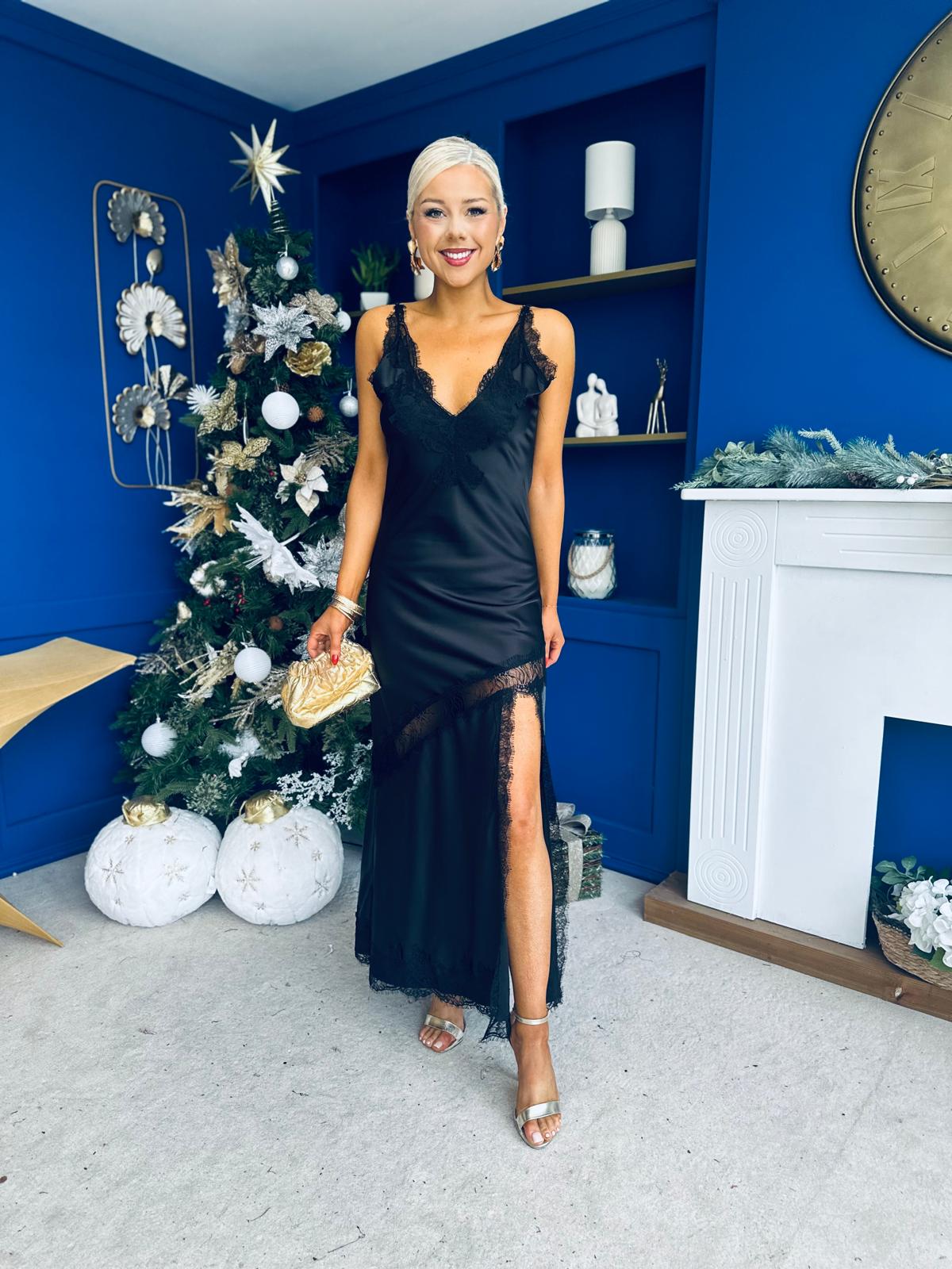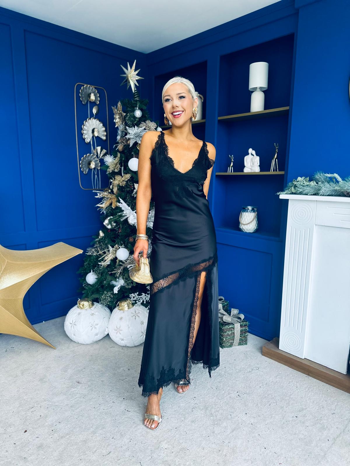 Unis Lace Detail Satin Slinky Dress Black