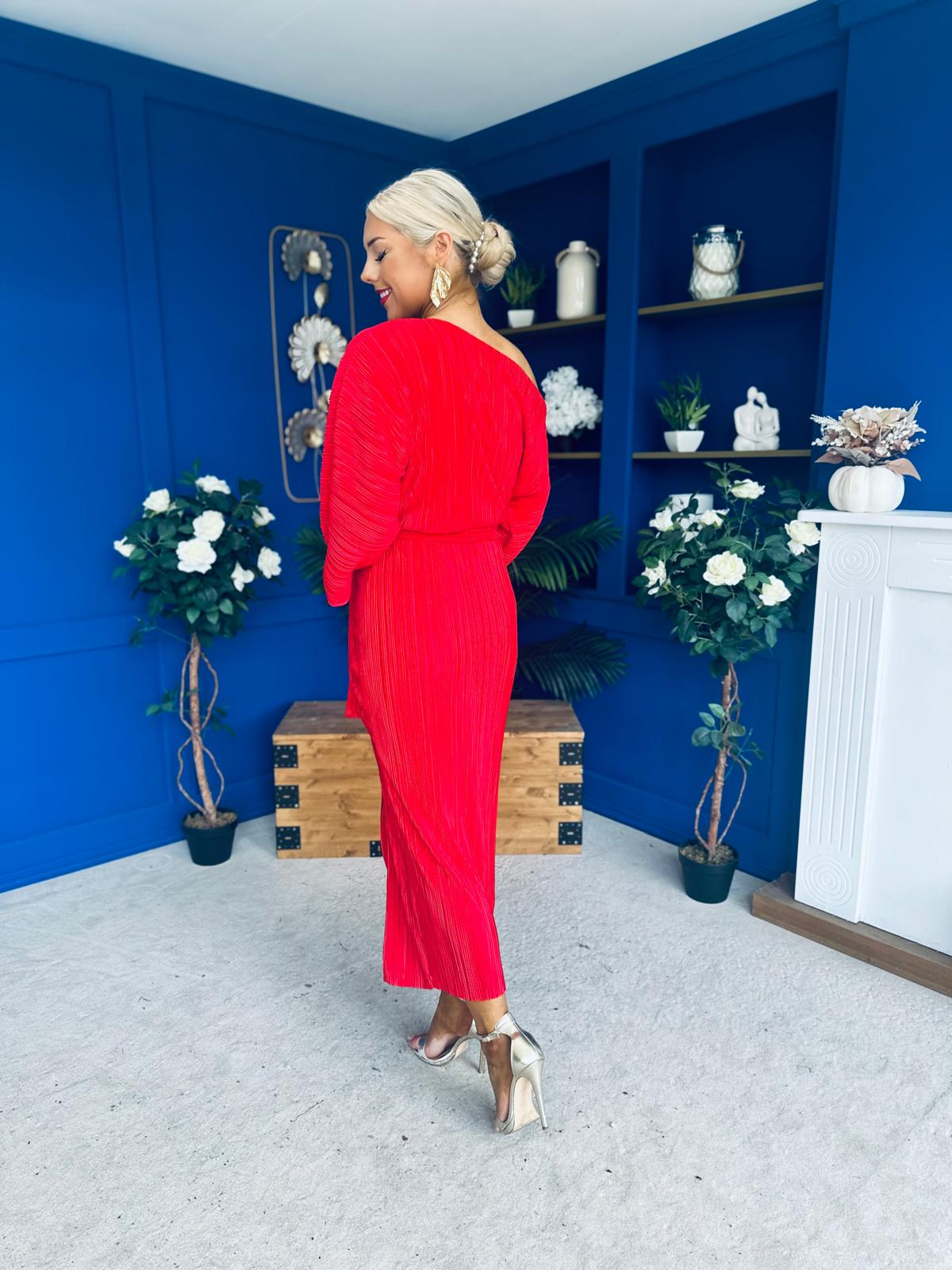 This plissé beauty features a flattering off-shoulder neckline and a ruched skirt that adds a touch of playful elegance.