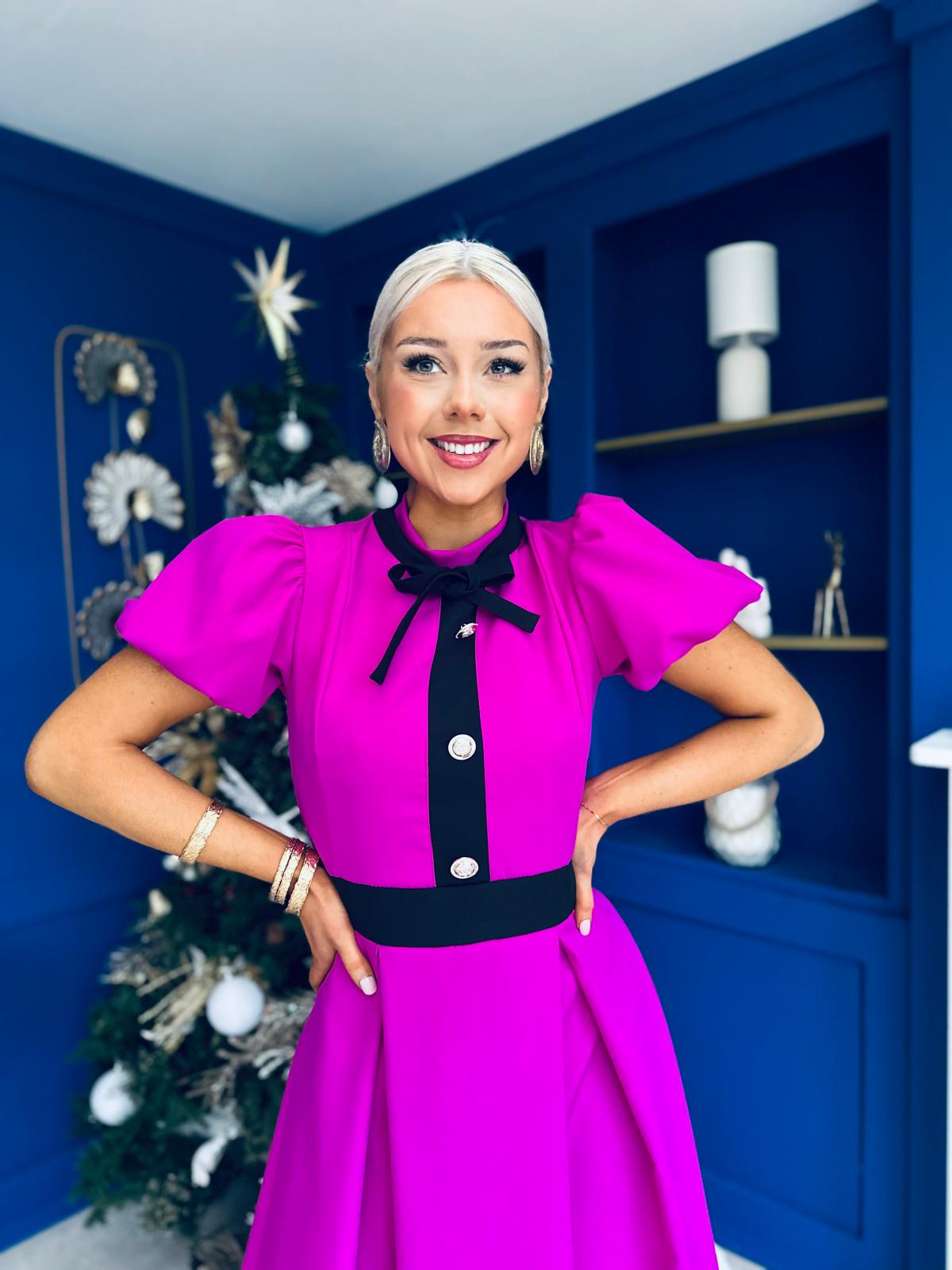 Our new Vicky dress with high detailed neckline, contrast block colour, gold button detail & A line box pleat skirt is simply fabulous