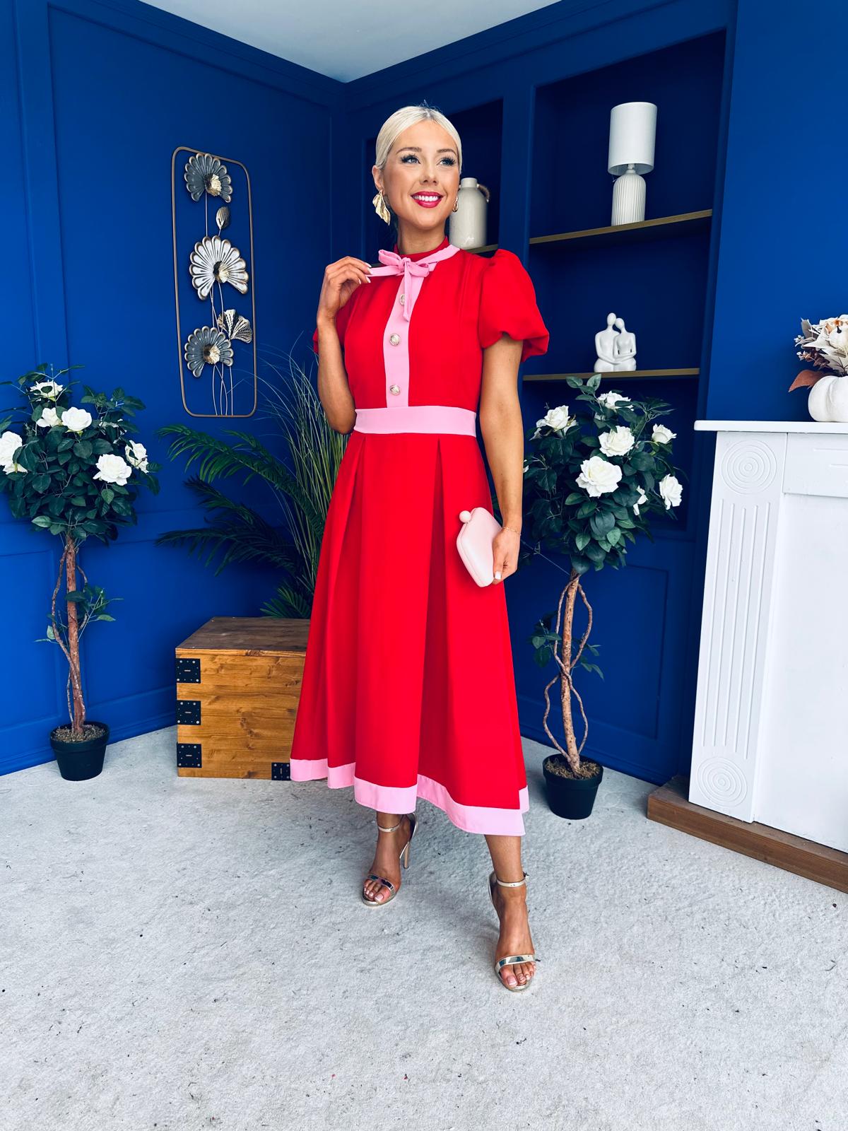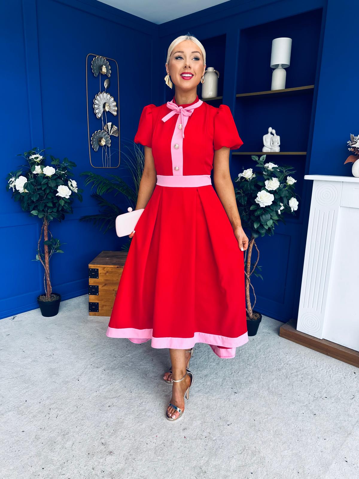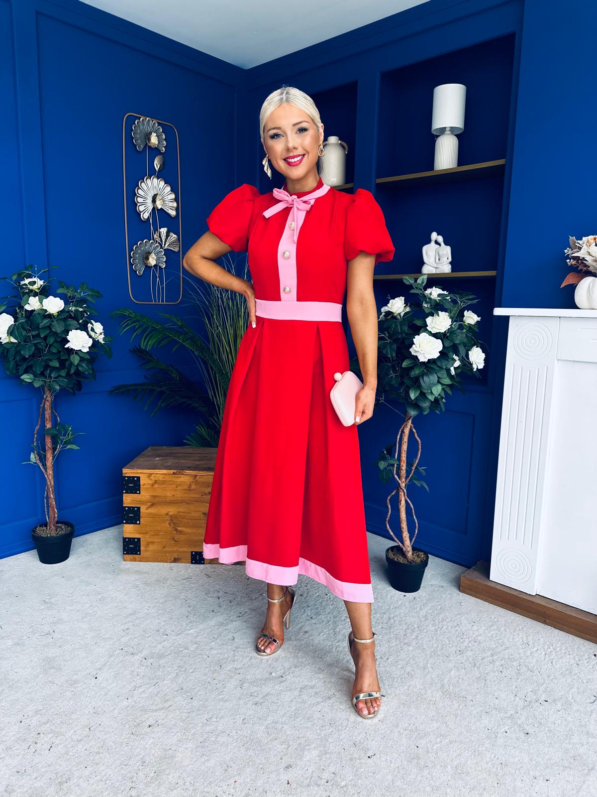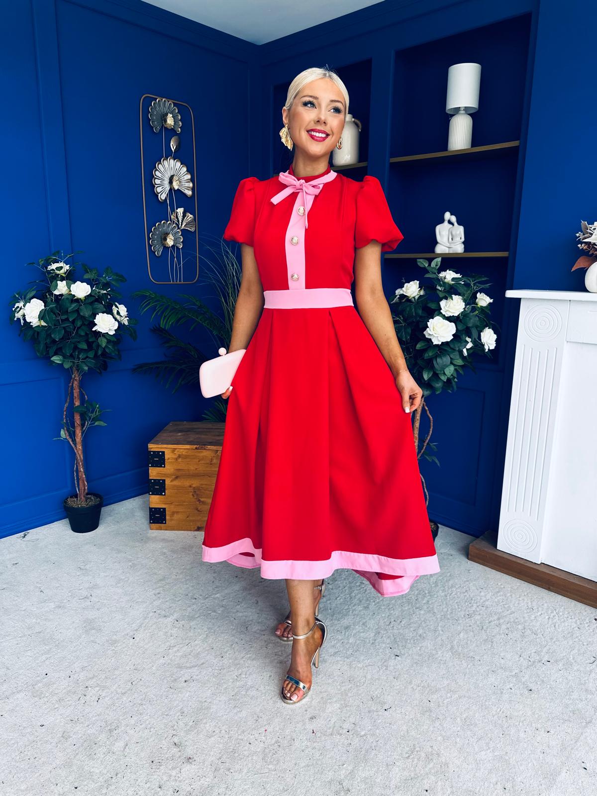 Vicky Puff Sleeve Occasion Midi Dress Red