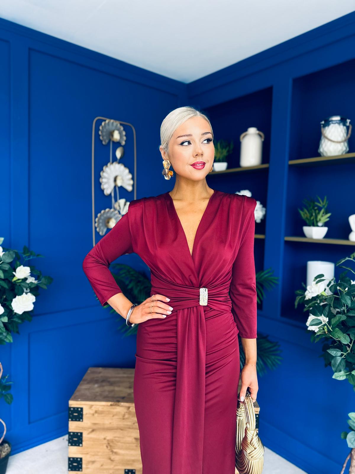 With it's padded shoulder, full sleeve, low V neckline & gathered midriff with gold detail clasp this dress is sure to catch the eye.