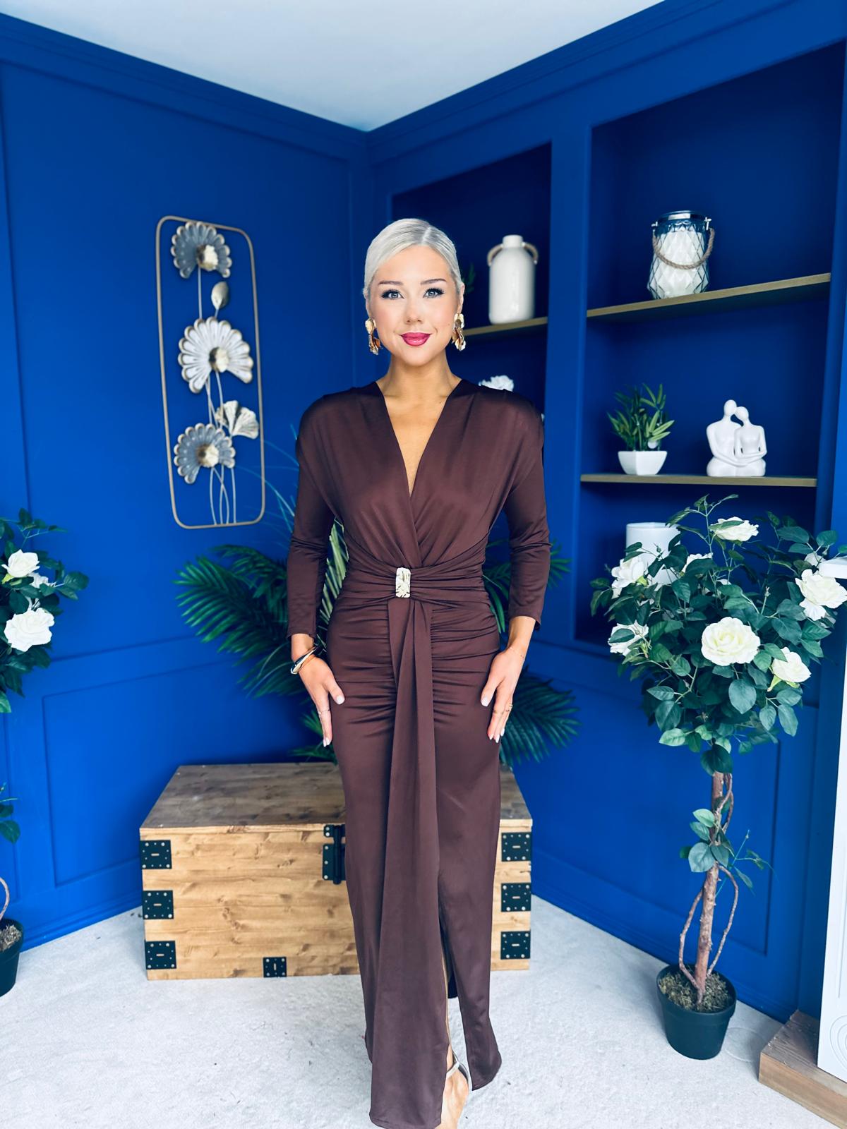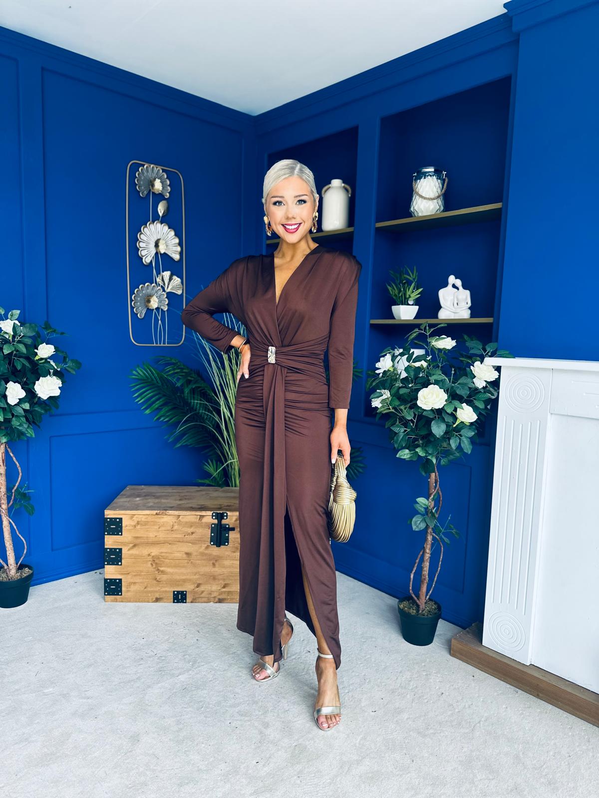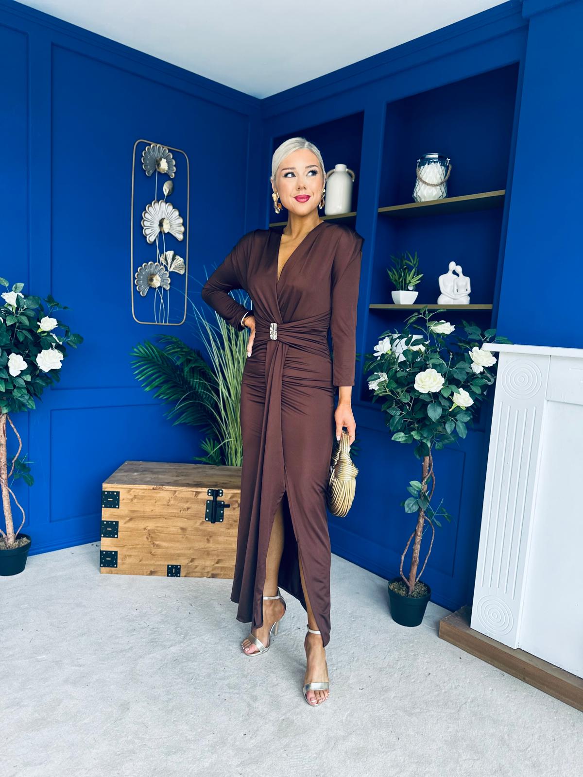 With it's padded shoulder, full sleeve, low V neckline & gathered midriff with gold detail clasp this dress is sure to catch the eye.