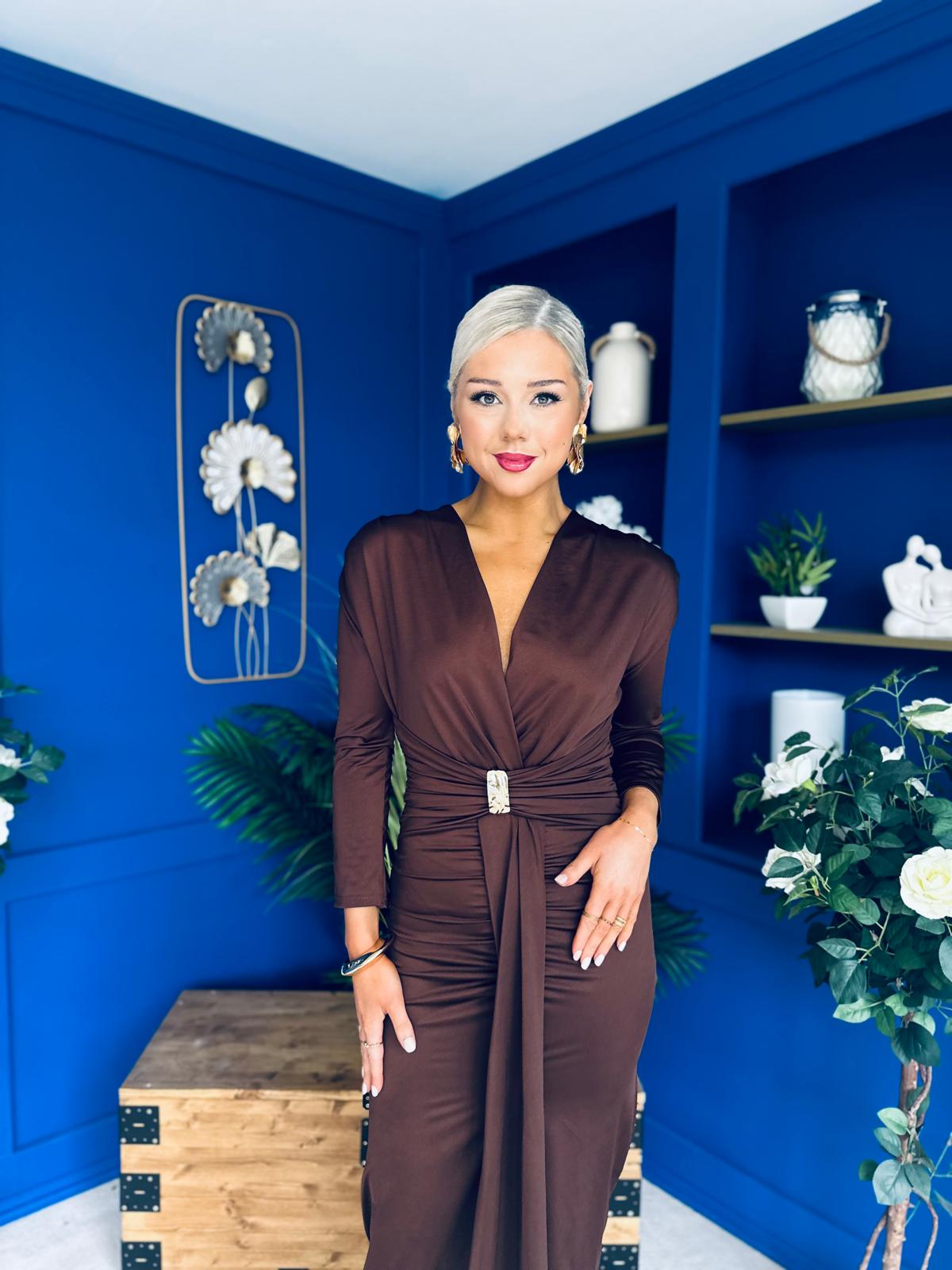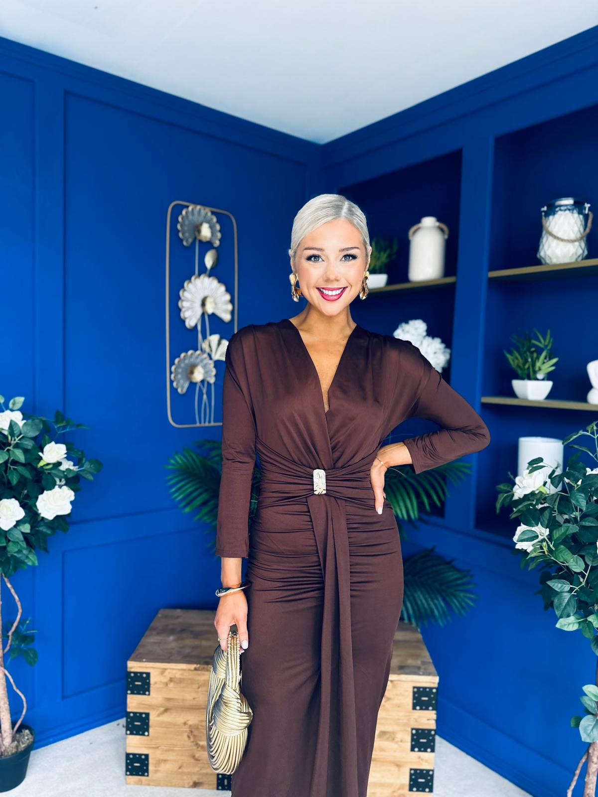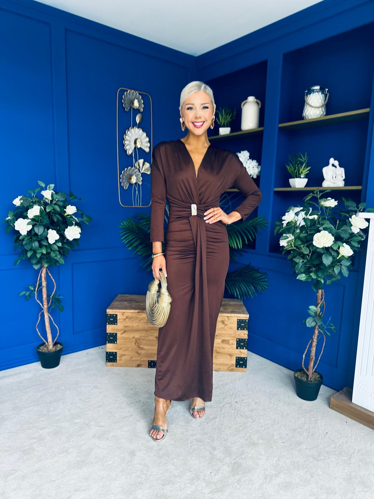 With it's padded shoulder, full sleeve, low V neckline & gathered midriff with gold detail clasp this dress is sure to catch the eye.